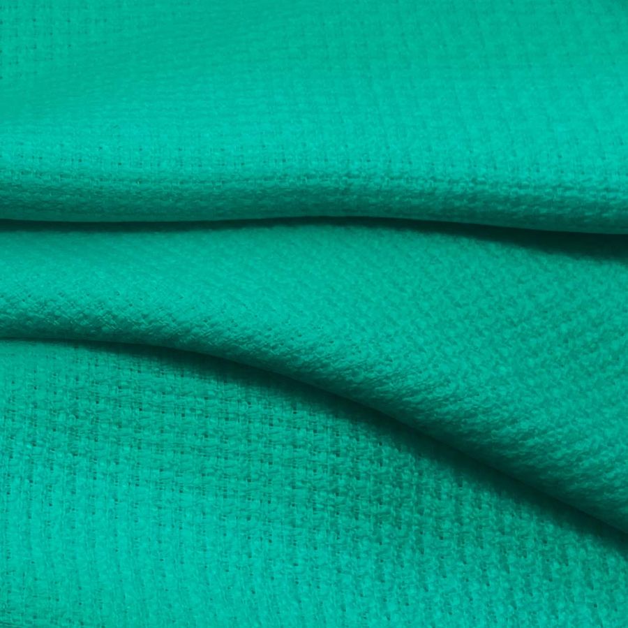 La tela base de este tejido es el Tweed-Chanel, una tela estilo Tweed de 100% poliéster con un gramaje de 420 gr/m2 y un ancho de 150 cm. El color liso impreso es un hermoso verde mar profundo, representado en la tinta cian (74) y amarilla (52) del CMYK. Este color simboliza la calma y la profundidad, evocando el océano y la tranquilidad que nos transmite. Combina maravillosamente bien con tonos beige, rosa oscuro y dorados.