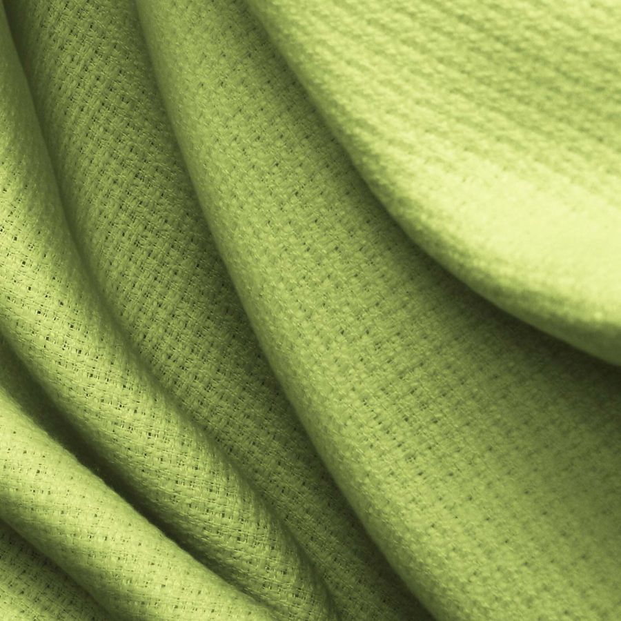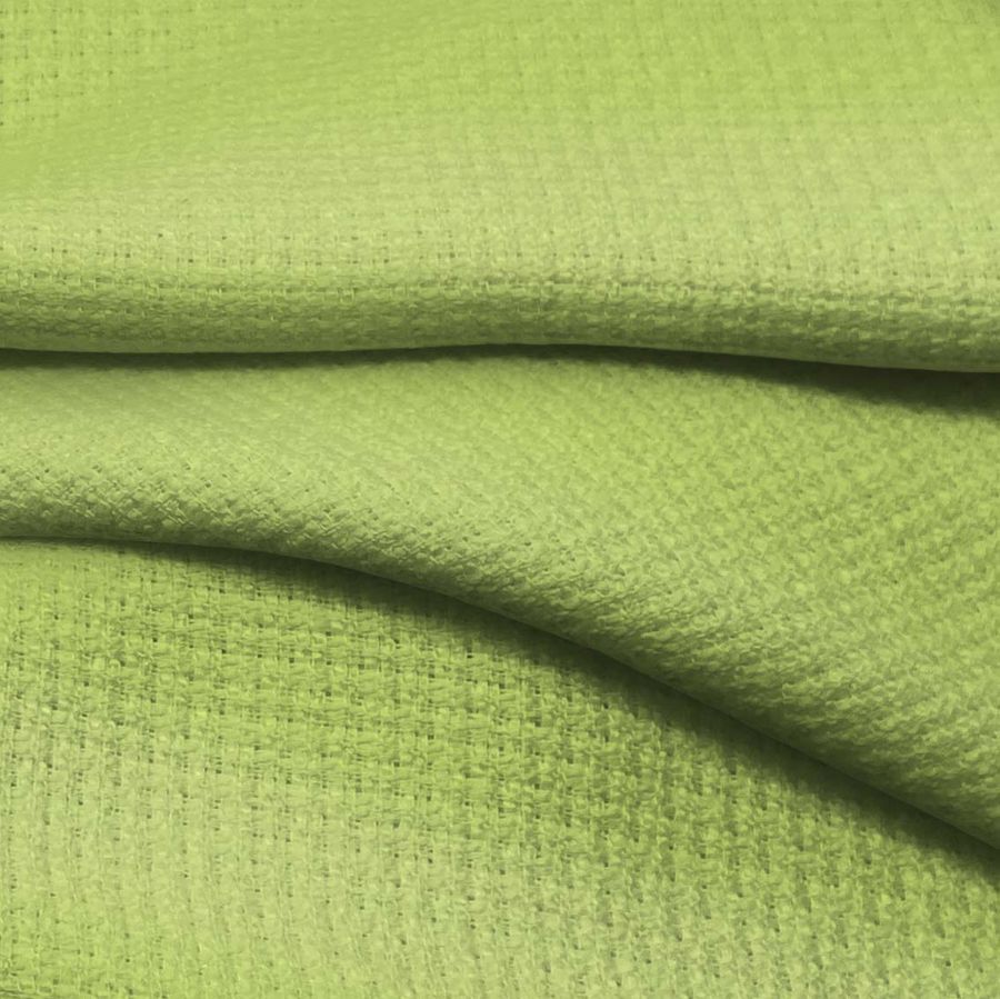 La tela base es Tweed-Chanel, compuesta por 100% poliéster con un gramaje de 420 gr/m2 y un ancho de 150 cm. El color liso impreso es Verde Periquito, con un CMYK de 34 0 71 0, lo que significa que la tinta cyan representa el 34% del color, mientras que la magenta y la tinta negra no se utilizan y la tinta amarilla representa el 71%. Este color representa frescura, vitalidad y energía creativa. Es un color que se asocia con la naturaleza y se combina especialmente bien con tonos neutros como beige o blanco, así como con tonos oscuros como negro o gris. El tejido está impreso con el color liso a una sola cara por impresión digital textil, lo que significa que no es un tejido tintado sino impreso por una sola cara.