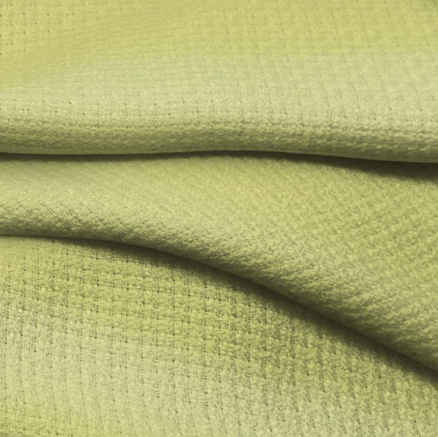 La tela base es el Tweed Chanel, un tejido de alta calidad compuesto por 100% poliéster con un gramaje de 420 gr/m2 y un ancho de 150 cm. El color liso impreso en la tela es un vibrante verde uva espina, con un contenido de CMYK de 23 7 62 0, lo que indica que la tinta cian y amarilla son las más utilizadas. En cuanto al color secundario, su simbolismo evoca la naturaleza, la tranquilidad y la estabilidad, lo que lo convierte en un color perfecto para prendas y accesorios de moda en otoño e invierno. Combina perfectamente con tonos beige, marrón, blanco y negro.