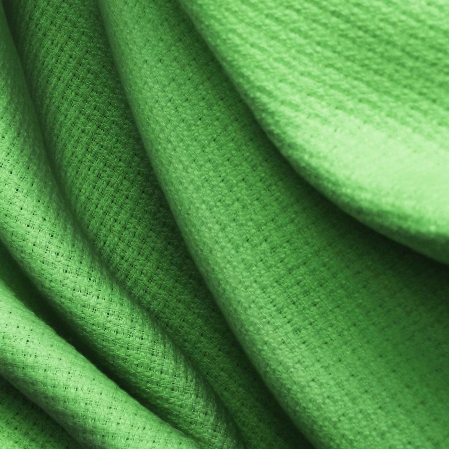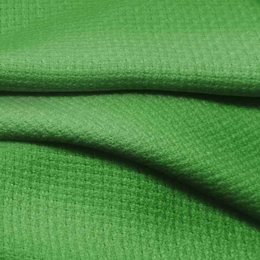 La tela base es un Tweed Chanel de 100% poliéster con un gramaje de 420g/m2 y un ancho de 150cm. El color liso impreso es Verde Mayo, con una composición de tintas en CMYK de 74 21 92 5. Este tono evoca la frescura de la primavera y combina muy bien con tonos tierra y neutros como marrones, beige y grises.