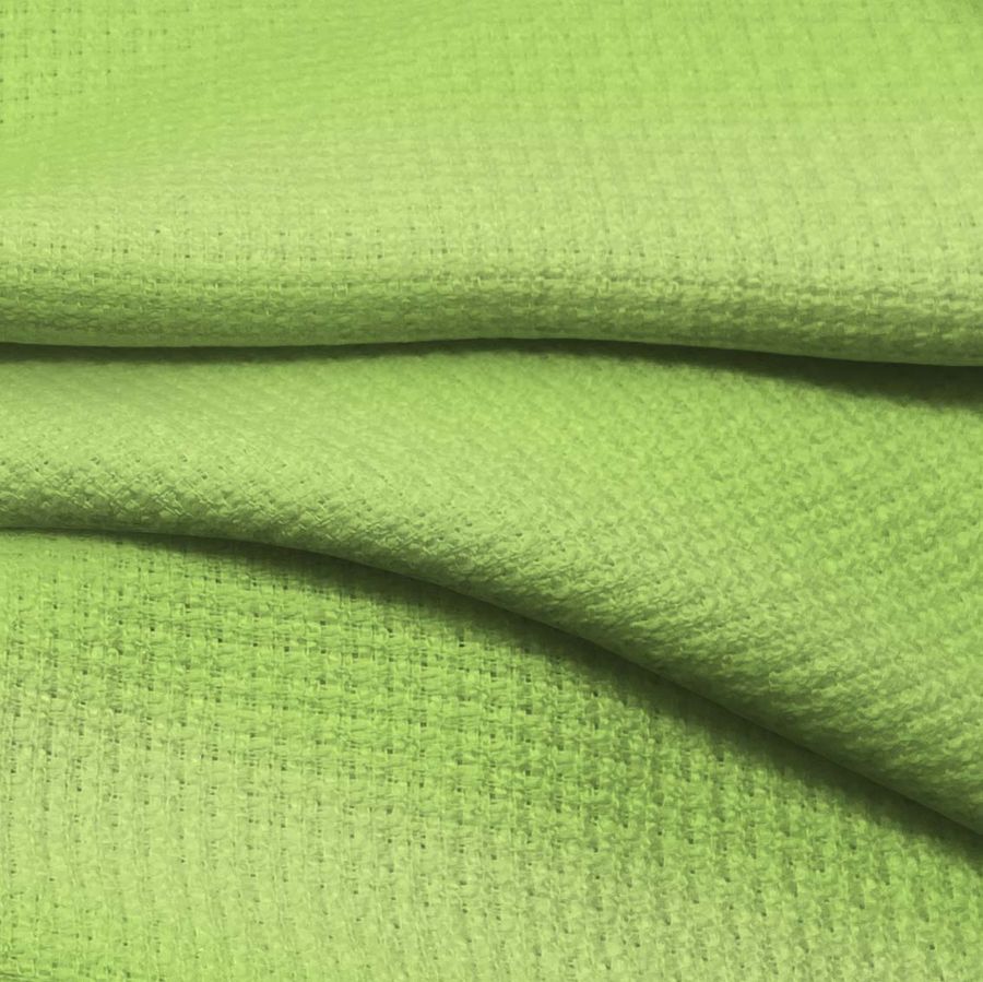 La tela base Tweed - Chanel es de tipo tweed, con composición 100% poliéster, un gramaje de 420 gr/m2 y un ancho de 150 cm. Su color liso impreso es Verde Nilo, con una combinación CMYK de 36 0 70 0.
