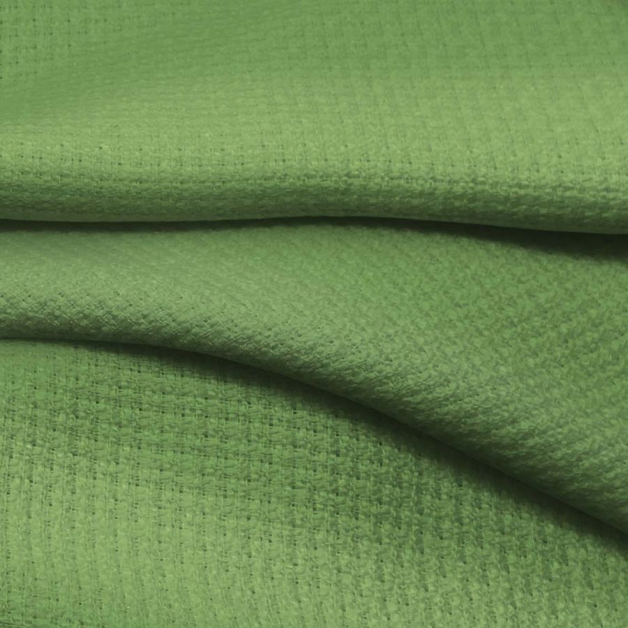 La tela base de este tejido es un Tweed - Chanel, con una composición del 100% POLIÉSTER, un gramaje de 420 gr/m2 y una anchura de 150 cm. El color liso impreso es un verde prado, que se logra con la combinación de Tinta Cyan: 61, Tinta Magenta: 22, Tinta Yellow: 77 y Tinta Black: 5, traducido al código CMYK 61 22 77 5. Este tono de verde simboliza la juventud, frescura y la renovación, aspectos muy relacionados con la moda, la decoración y el hogar. En cuanto a su técnica, se utiliza la sublimación de POLIÉSTER para lograr una impresión digital textil a una sola cara.