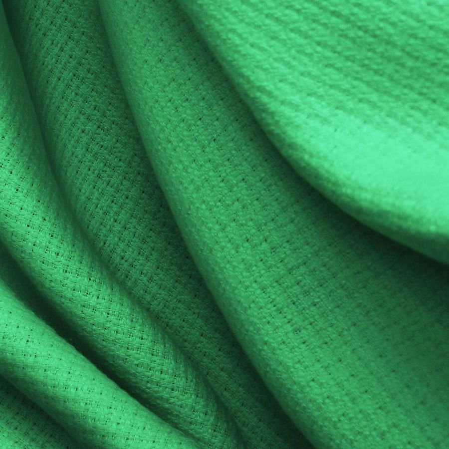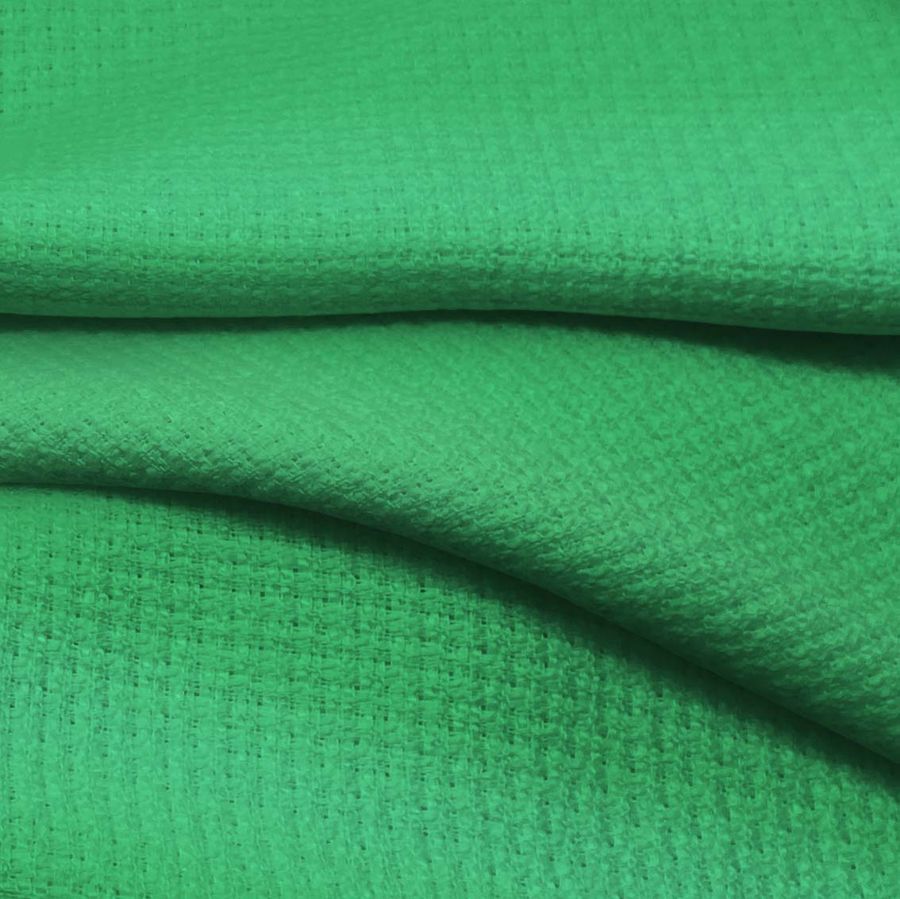 La tela base del Tweed - Chanel es un tejido de poliéster de 420 gr/m2 de gramaje y un ancho de 150 cm, con un cuidadoso tratamiento y acabado que le confieren su característica textura rígida. El color liso impreso en este tejido es un refrescante tono verde primavera, obtenido a través del uso de tinta sublimación. Los valores de la tinta Cyan y Yellow son del 71%, y del 0% para la tinta Magenta y la tinta Black. El resultado del color impreso se refleja en el CMYK con un valor de 71 0 73 0.