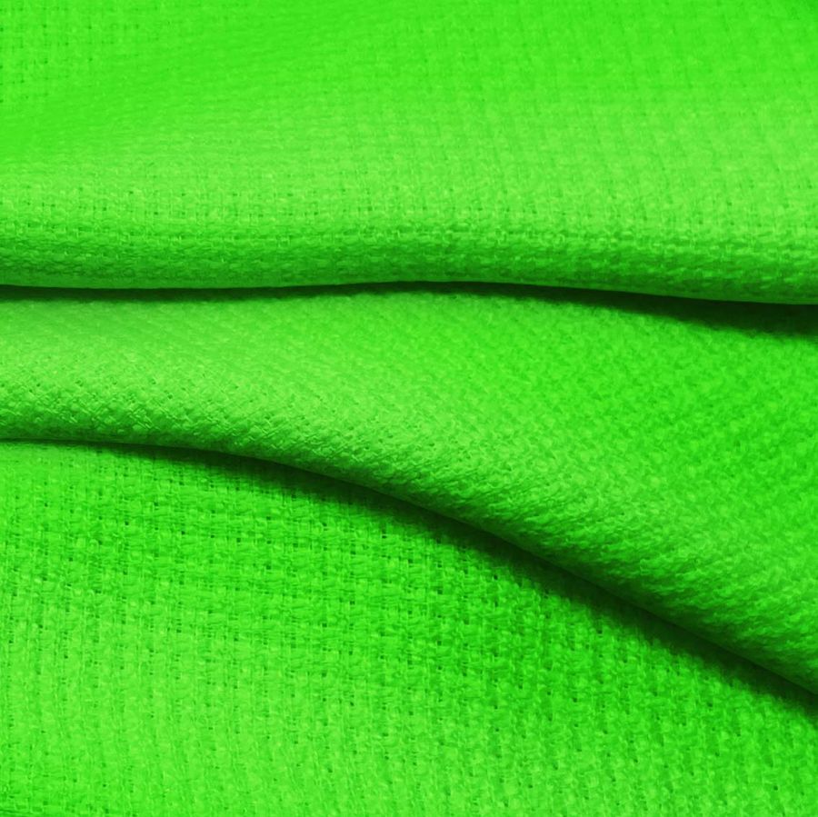 La tela base Tweed-Chanel en color liso está impreso con un tono verde veneno, cuyo contenido de CMYK es 63 0 100 0. Este color exuda una personalidad enigmática y sofisticada, transmitiendo intensidad y fuerza. Combina a la perfección con colores neutros como blanco, beige y negro, así como con tonos anaranjados y marrones.