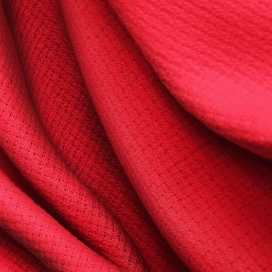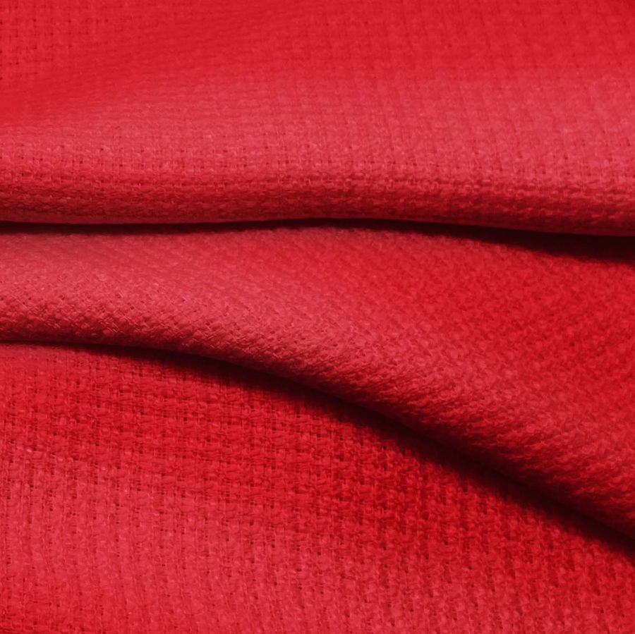La tela base Tweed-Chanel de poliéster presenta un gramaje de 420 gr/m2 y un ancho de 150 cm, siendo una tela rígida al tacto. El color liso impreso es Rojo Lava, con una composición CMYK de 11 100 92 3. Este color simboliza el fuego, la pasión y el amor, siendo ideal para prendas de alta costura y accesorios sofisticados. El Rojo Lava combina perfectamente con tonos oscuros como el Negro, el Gris y el Marrón, así como con la gama cromática de los rojos. Cabe destacar que la tela está impresa a una sola cara por impresión digital textil.