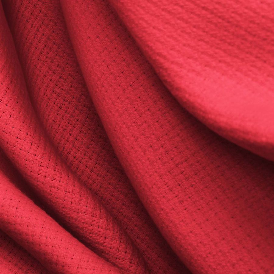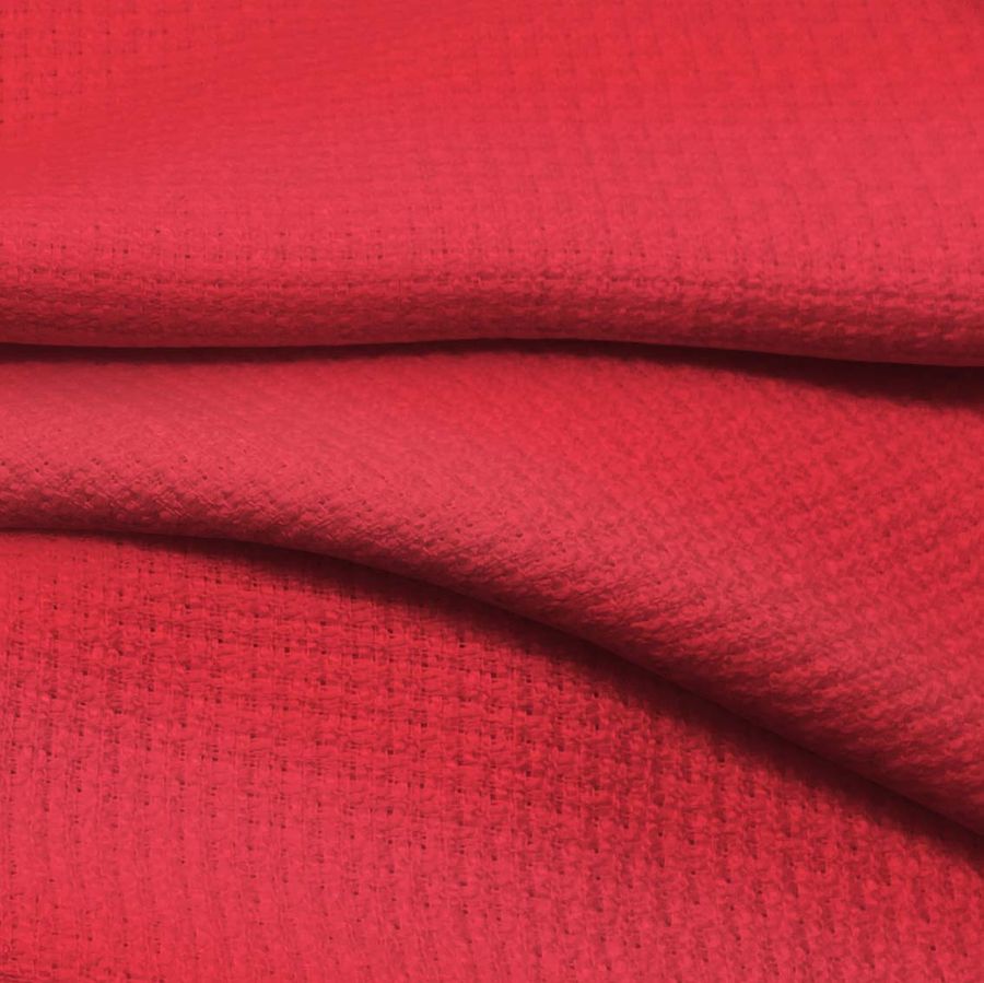 La tela base es un Tweed Chanel compuesto por 100% poliéster, con un gramaje de 420 gr/m2 y un ancho de 150 cm. El color liso impreso es Rojo Pantone con un CMYK de 0 89 68 0, lo que lo convierte en un tono rojo intenso con un matiz magenta y amarillo. Este color secundario aporta un sentido de calidez y vitalidad a cualquier prenda o accesorio que se confeccione con este tejido. Combina muy bien con tonos neutros como el negro, gris o beige, y también con tonos complementarios como los verdes y azules.