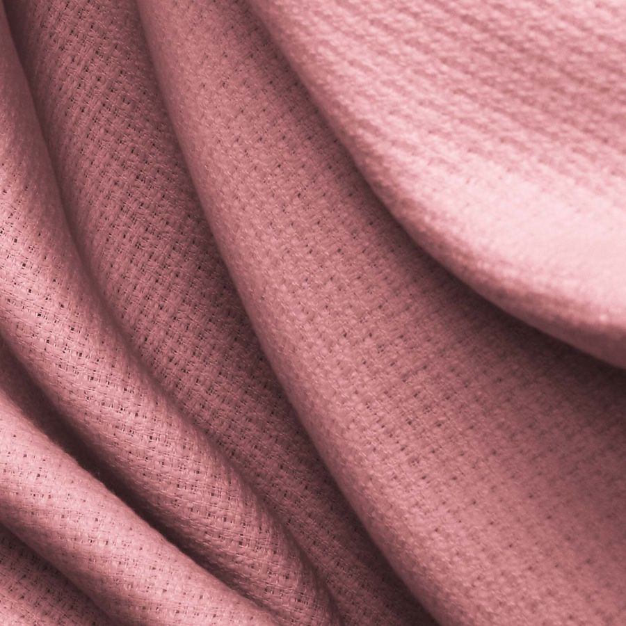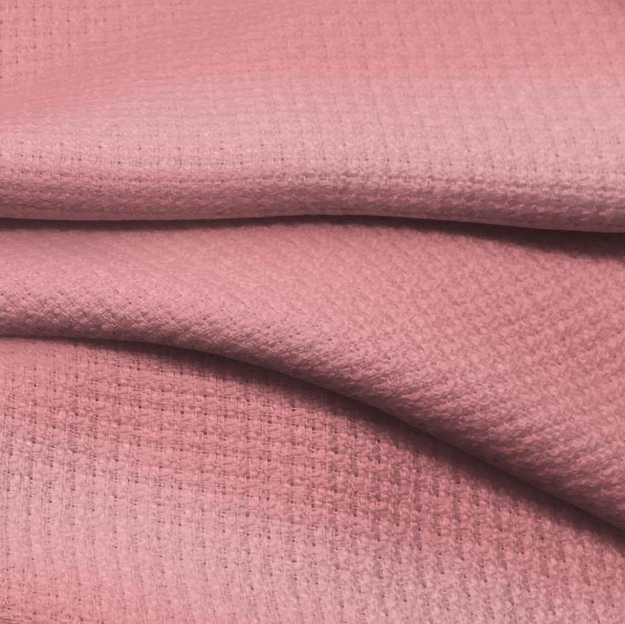 La tela base es el Tweed-Chanel, un tejido de poliéster con una textura rígida. Su color liso impreso es Rojo Sandia con un CMYK de 0 53 29 0, lo que le da un tono vibrante y atractivo. Este color es una mezcla perfecta entre el rojo escarlata y el naranja intenso, lo que refleja energía, pasión y vitalidad. El Rojo Sandia combina bien con otros colores tierra como el beige, el marrón y el dorado para crear un aspecto cálido y vibrante.