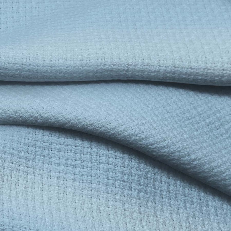 El Tweed Chanel es una tela de poliéster de 420 gr/m2, con un ancho de 150 cm, que destaca por su textura rígida. El color liso impreso es Azul Angel, con una combinación de tintas CYMK de 43/13/7/0. Este color representa la tranquilidad del cielo y el mar, aportando armonía a cualquier diseño. Combina muy bien con tonalidades tierra y blancos. El tejido está impreso con el color liso a una sola cara mediante impresión digital textil.