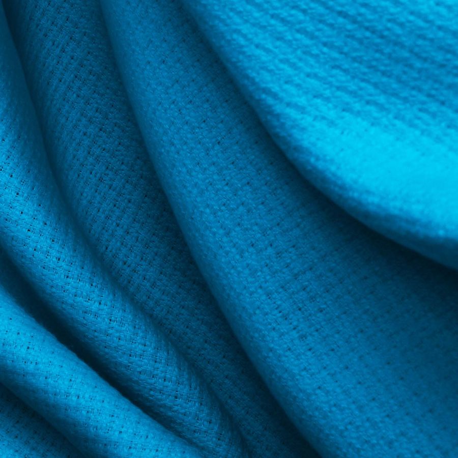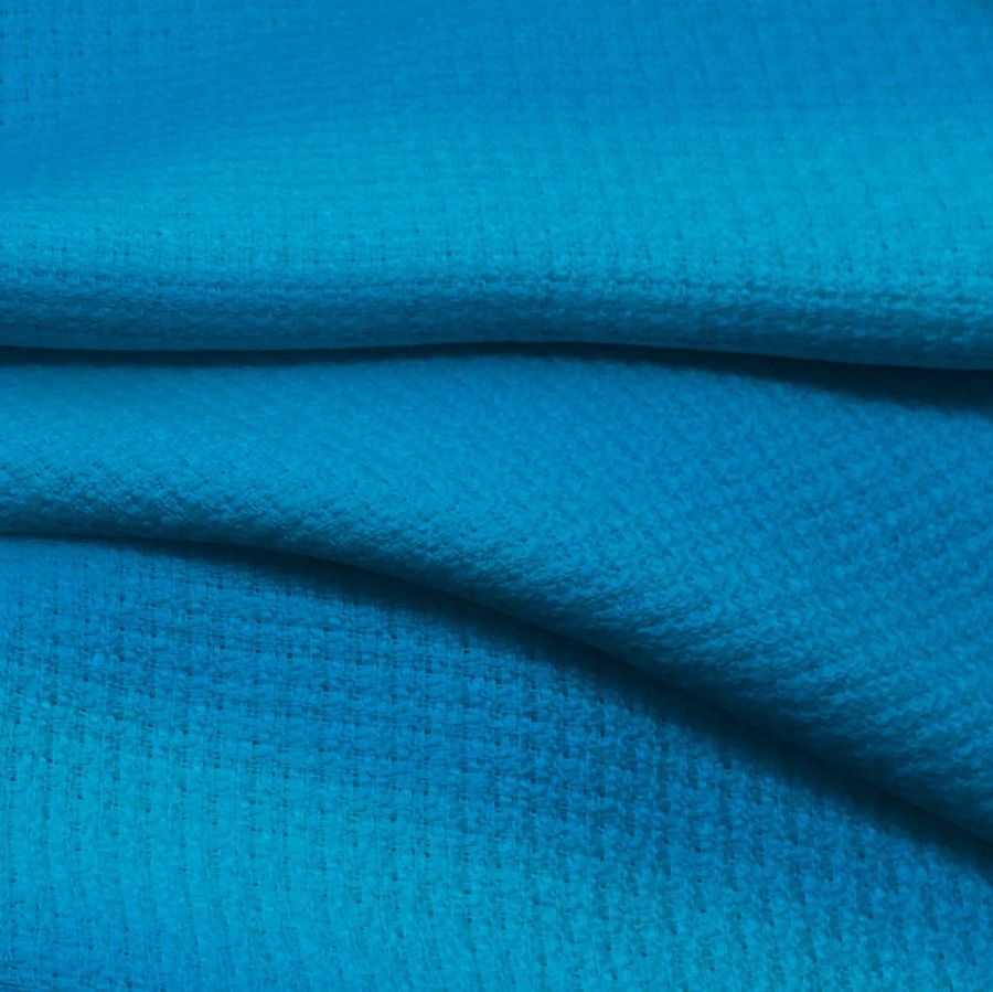 La tela base es el Tweed Chanel, una tela de poliéster de 420 gr/m2 y ancho de 150 cm. El color liso impreso es en tono Azul Caribe, con un CMYK de 83 38 3 0. Este tono se caracteriza por ser sereno y refrescante, como las aguas tropicales del Caribe. Combina perfectamente con tonalidades neutras como el blanco y el gris, así como con tonalidades más cálidas como el beige y el marrón.