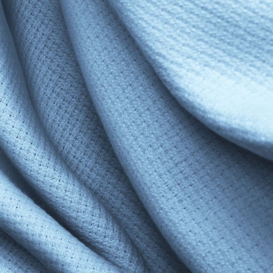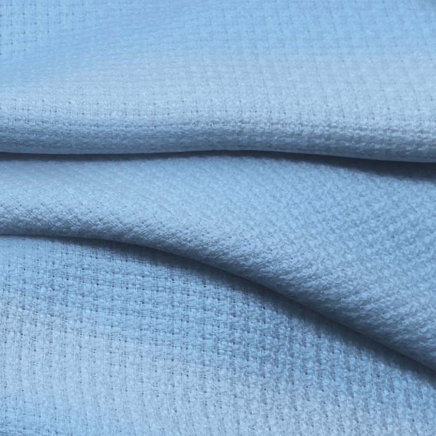 La textura de la tela base es rígida, con un tacto complejo en el que se puede sentir claramente la trama del tweed. Respecto al color impreso, se puede distinguir claramente la suavidad del tono Azul cielo, que luce enérgico en su presencia, destacando en la tela base. Es importante destacar que la tela base presenta una gran versatilidad, ya que es utilizada en una gran variedad de aplicaciones y usos. Por ejemplo, en prendas de moda para mujer y hombre como chaquetas, blazers, abrigos, faldas, vestidos, cazadoras, chalecos, shorts o bermudas, pajaritas, así como en accesorios como gorras. También se utiliza en deportes para fabricar chalecos para mujer, hombre y niño, así como en textiles para el hogar como cojines tanto para el salón, dormitorio como para la cocina.