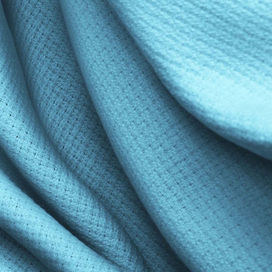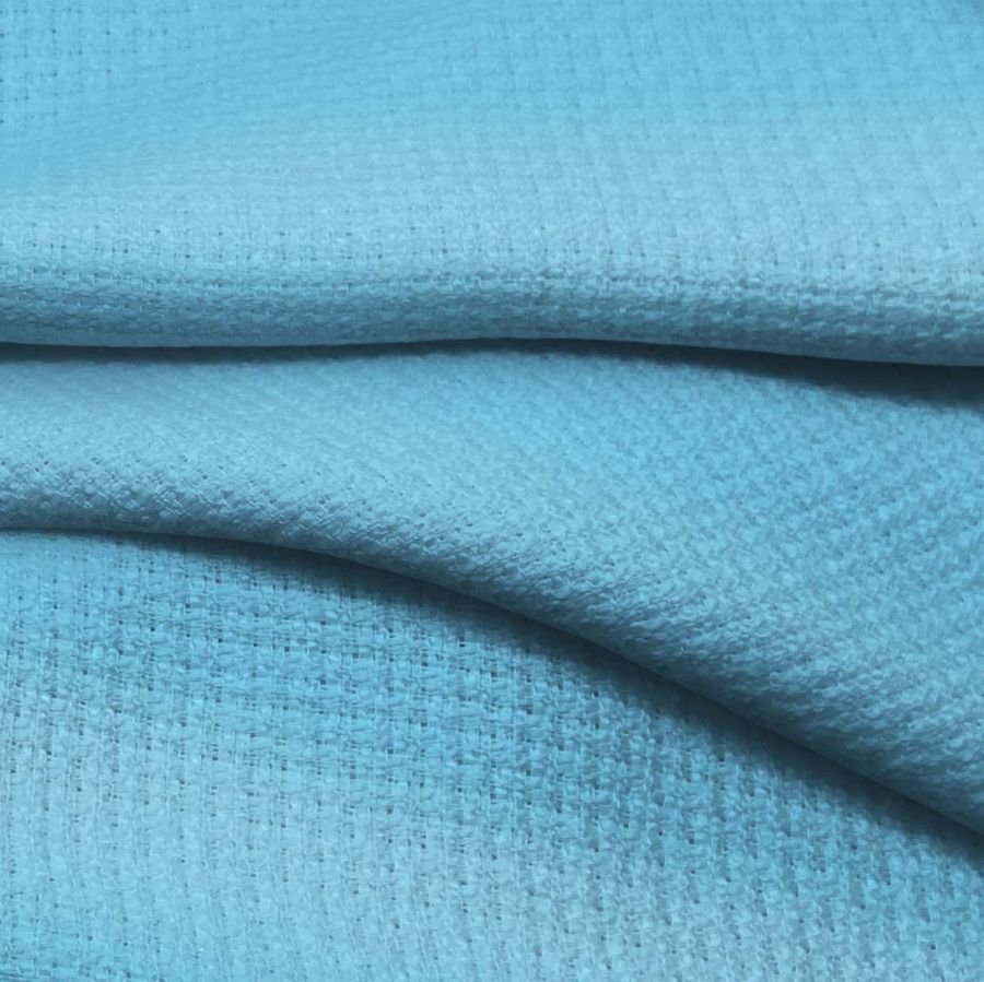 La tela base Tweed-Chanel, con una composición del 100% POLIÉSTER, se presenta en un atractivo color azul claro, impreso con una tinta Cyan del 55%, Magenta del 3%, Yellow del 0% y Black del 0%, que en su conjunto ofrece un efecto suave e invernal.