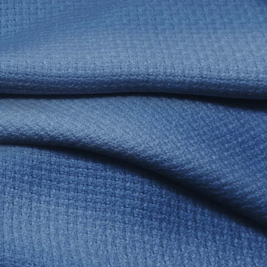 La tela base es Tweed - Chanel de 100% poliéster con un gramaje de 420 gr/m2 y ancho de 150 cm. El color liso impreso es Azul Clemátide, con tinta Cyan: 82, Magenta: 59, Yellow: 24 y Black: 8, con un CMYK de 82 59 24 8. El color secundario es un azul intenso con toques violetas y está relacionado con la imaginación y creatividad. Combina perfectamente con matices cálidos, como beige o dorado, así como con colores fríos como gris o blanco.