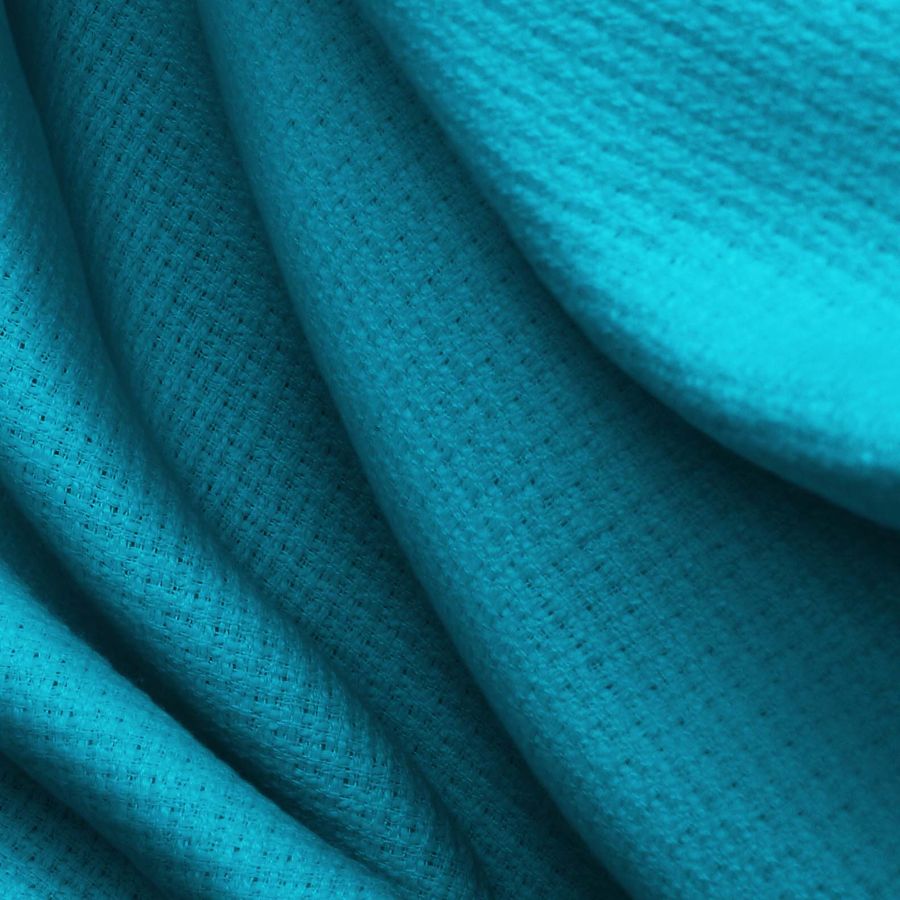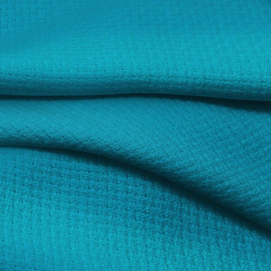 La tela base es el Tweed - Chanel, un tejido de tweed compuesto por 100% poliéster con un gramaje de 420 gr/m2 y un ancho de 150 cm. El color liso impreso es un azul coral con un CMYK de 79 24 24 4. Este color secundario se describe como vibrante y lleno de vitalidad, evocando la energía del mar y el sol. Combina muy bien con colores claros y brillantes como el blanco, el dorado y el coral.