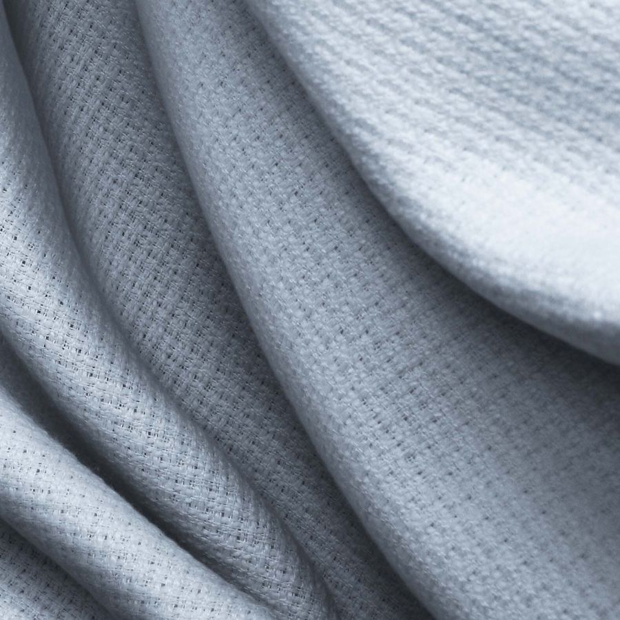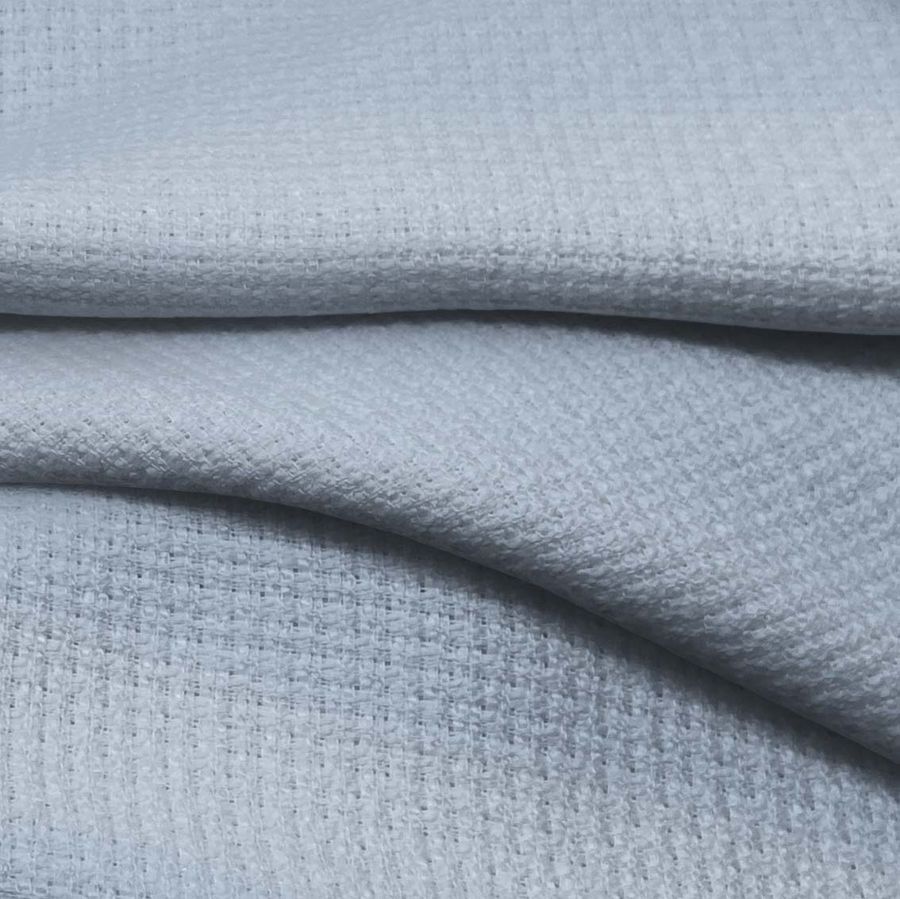 La tela base es una elegante mezcla de poliéster conocida como Tweed - Chanel, con una textura rígida y un peso de 420 gr/m2 y un ancho de 150 cm. El color liso impreso es un hermoso tono azul de China, que está compuesto por 37 de tinta cian, 19 de tinta magenta, 11 de tinta amarilla y 0 de tinta negra, utilizando la técnica de impresión digital textil por sublimación. Este tono de azul amplifica la sensación de tranquilidad, calma y relajación, evocando la serenidad de la naturaleza y el paisaje marino. Es un color versátil que combina particularmente bien con tonos neutros como el beige, el marfil o el blanco, y también con colores cálidos como el amarillo, el naranja y el rosa.