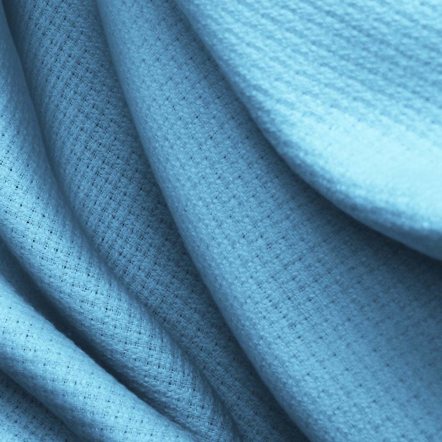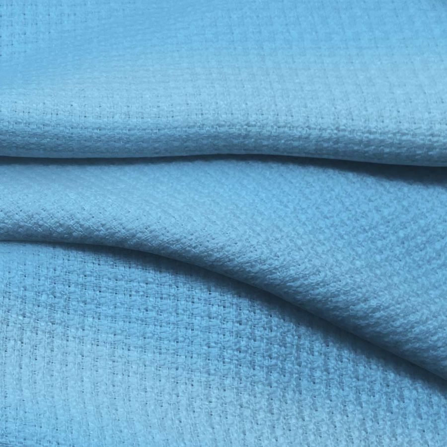 La tela base es el Tweed- Chanel, 100% poliéster, con un gramaje de 420 gr/m2 y un ancho de 150 cm. El color liso impreso es Azul Frita con un CMYK de 53 11 0 0, lo que sugiere una tonalidad rica y profunda, con una presencia evidente de la tinta cian. Este color se combina maravillosamente con tonos pasteles y colores cálidos como el rosa pálido, beige y marrón claro. Es importante destacar que el tejido está impreso con el color liso a una sola cara por impresión digital textil, lo que significa que el color es más definido y vibrante en un lado.