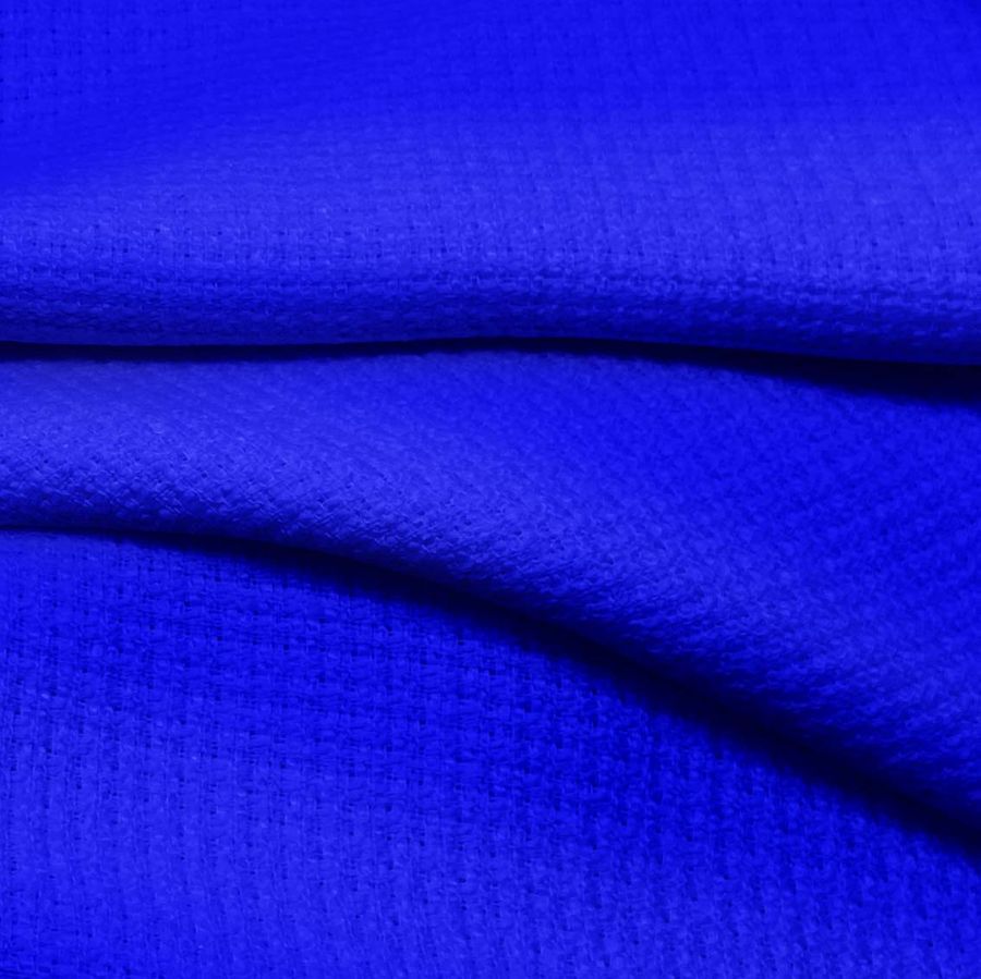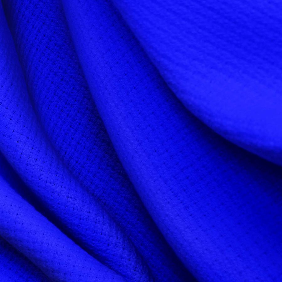 La tela base de la prenda es un Tweed-Chanel, compuesto al 100% de poliéster con un gramaje de 420 gr/m2 y ancho de 150 cm. El color liso impreso es un tono azul-mate con tintas en CMYK de 93-75-0-0. Este color se caracteriza por su sutileza y elegancia, transmitiendo tranquilidad y serenidad. Además, combina a la perfección con tonos neutros como el blanco y el gris, y con colores más fuertes como el rojo y el naranja.