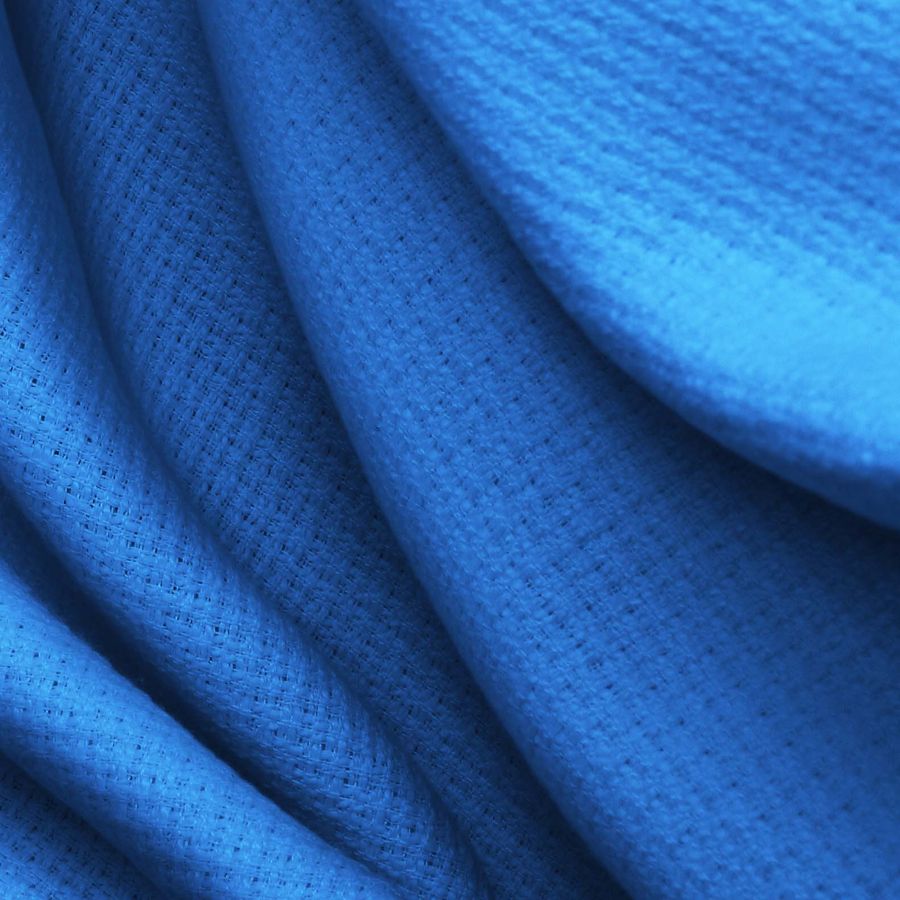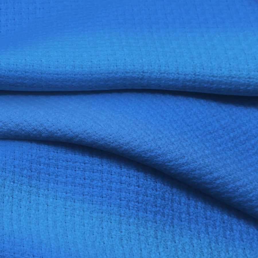 La tela base es el Tweed - Chanel, de composición 100% poliéster y un gramaje de 420 gr/m2. Su color liso impreso es un tono azul océano, con una combinación de tintas de cian (79) y magenta (53), sin presencia de tinta amarilla ni negra, lo que le da un aspecto limpio y fresco. Este color se combina muy bien con tonos tierra como marrones y beiges, así como con colores complementarios como el verde y el naranja.
