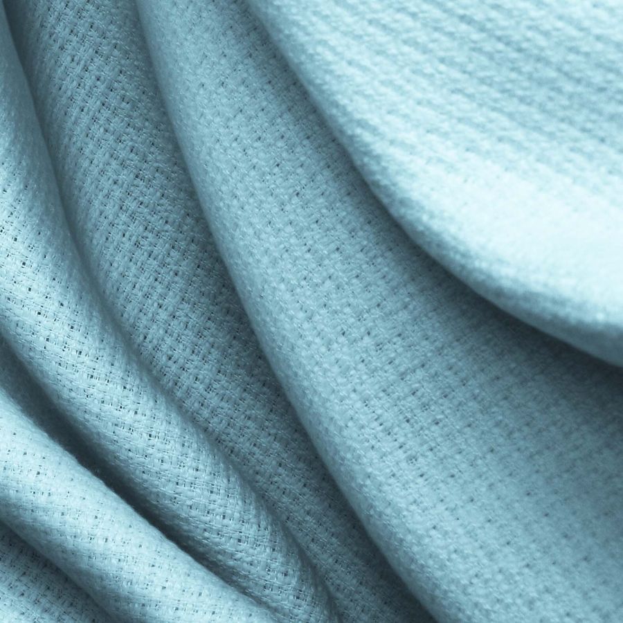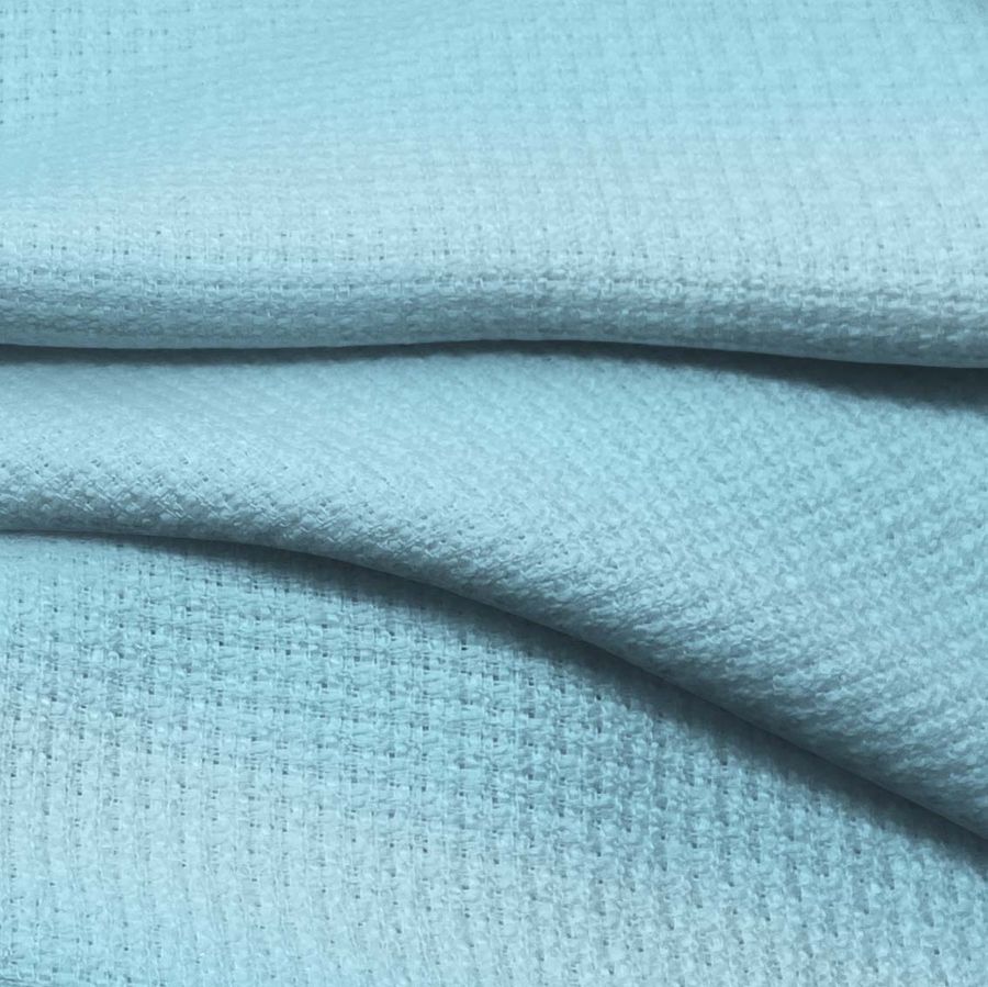 La tela base de este tejido es un tweed Chanel de poliéster con un gramaje de 420 gr/m2 y un ancho de 150 cm. El color liso impreso en esta tela es un azul pálido, con una combinación de tintas cyan, magenta, yellow y black en CMYK de 37 0 2 0. Este color se presenta como un tono suave y tranquilo, ideal para confeccionar prendas elegantes y sofisticadas.
