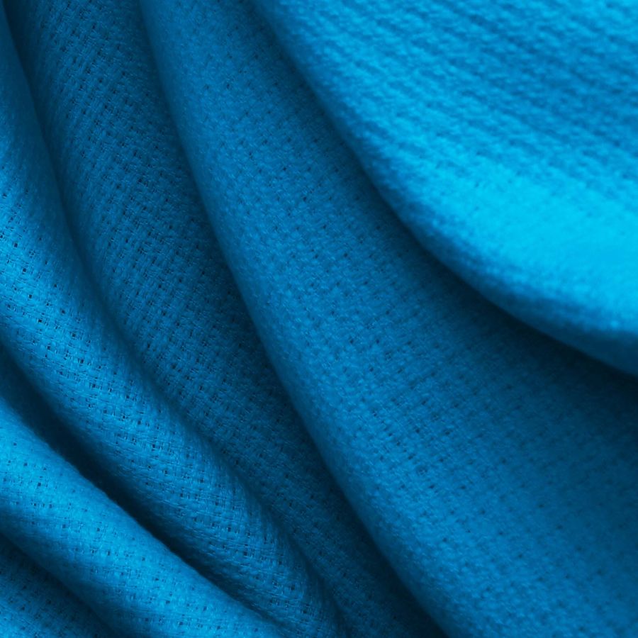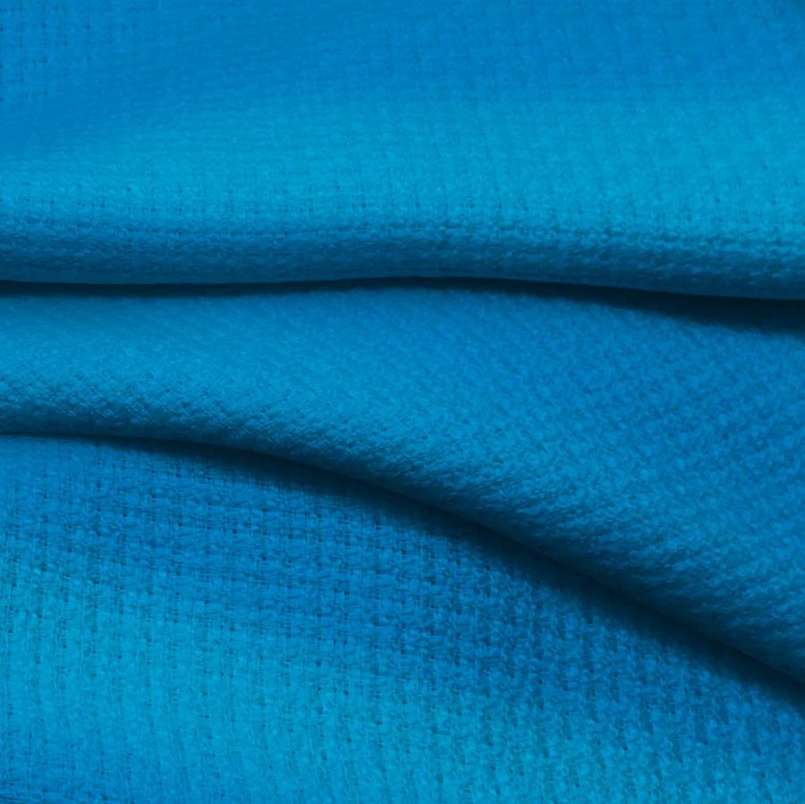 La tela base es un tweed de composición 100% poliéster, con un gramaje de 420 gr/m2 y un ancho de 150 cm. El color liso impreso es azul phthalo, indicado por un CMYK de 84 42 0 0. Este color se describe como un azul verdoso intenso y profundo, que evoca al mar y a la naturaleza. Combina bien con tonos claros como el blanco, beige o rosa claro, y con tonos más oscuros como el gris o el negro.