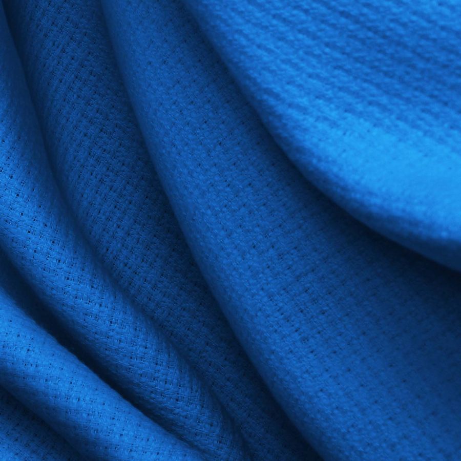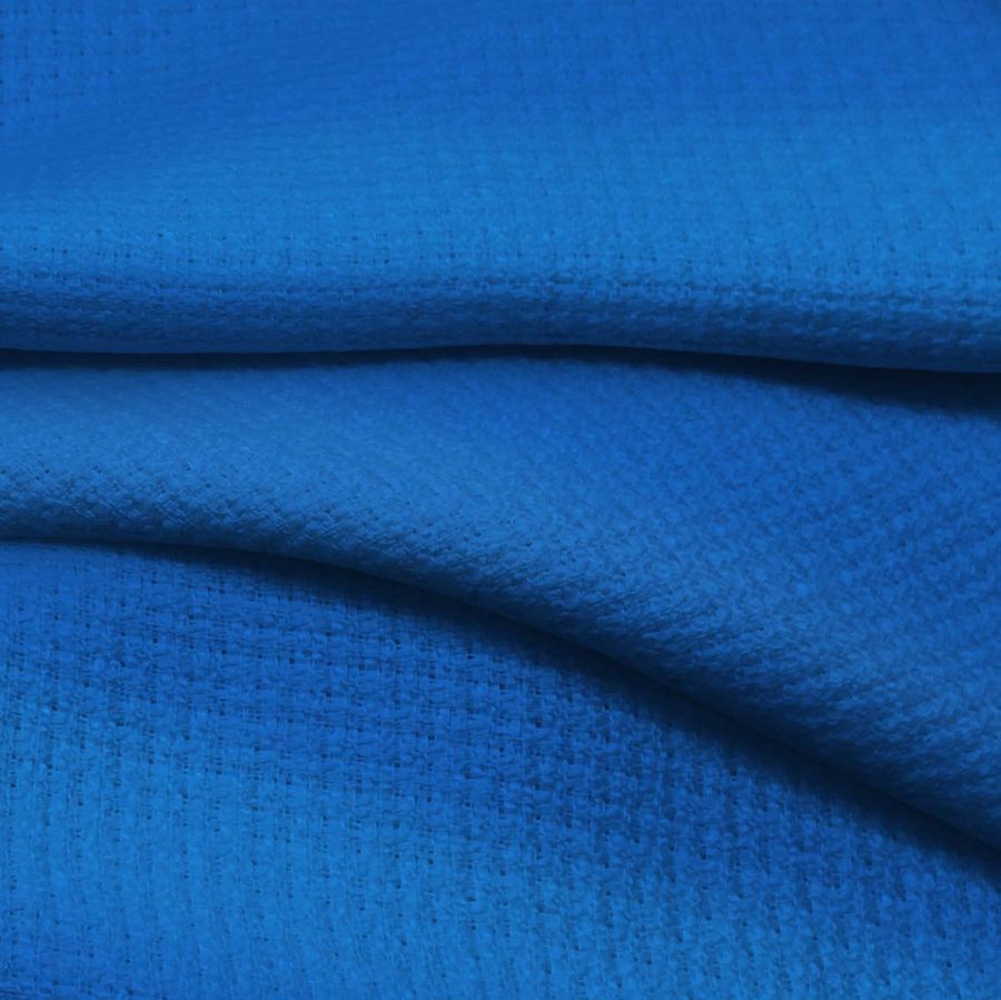 La tela base Tweed Chanel es un tweed de poliéster de alta calidad con un gramaje de 420 gr/m2 y un ancho de 150 cm. El color liso impreso es de un tono azul intenso y llamativo, el cual contiene un CMYK de 88 61 0 0. Este color tiene un matiz azul tejano, que combina perfectamente con el color blanco hueso, gris rata, marrón chocolate y mostaza.