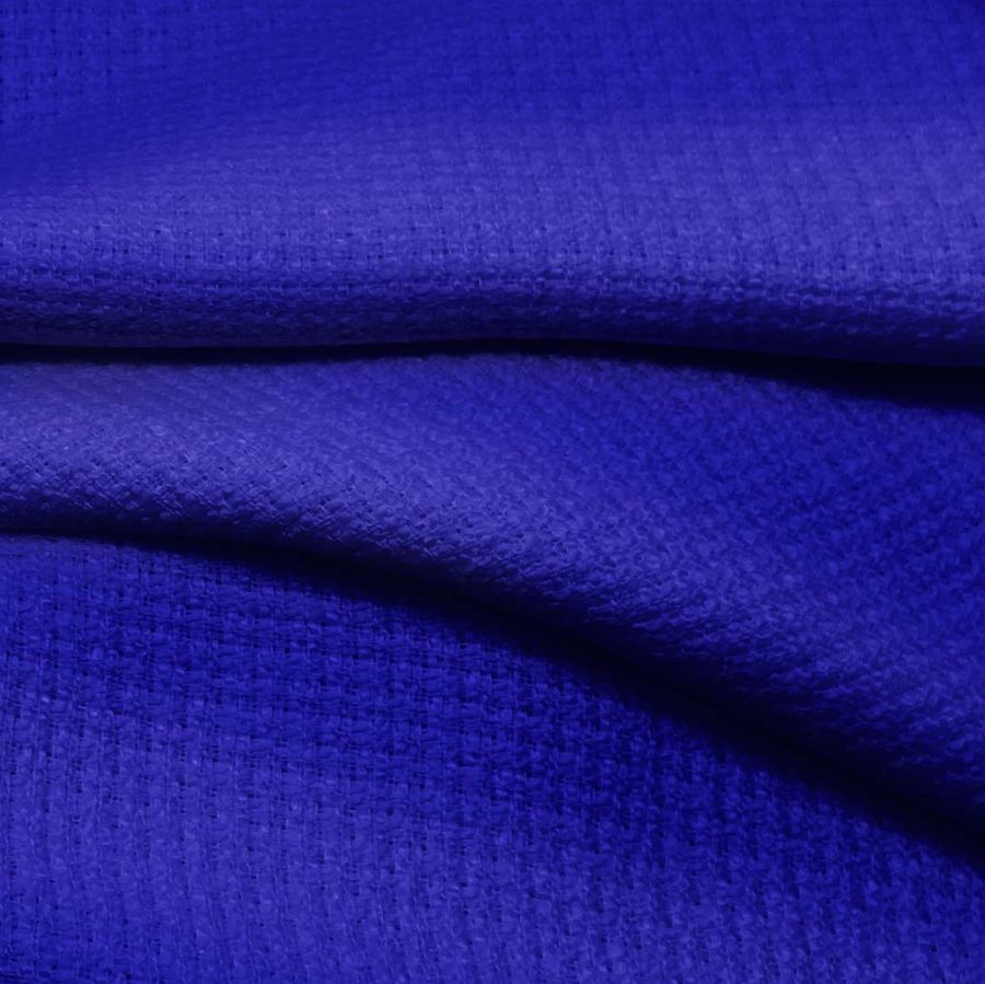 El tweed Chanel es una tela de poliéster, con un pesado gramaje de 420 gr/m2 y un ancho de 150 cm. El color liso impreso es un azul uniforme, cuyo contenido CMYK es 100-93-19-4, lo que le da un tono oscuro y profundo. Este color simboliza la estabilidad, serenidad y confianza, y combina especialmente bien con tonos tierra, dorados y plateados.