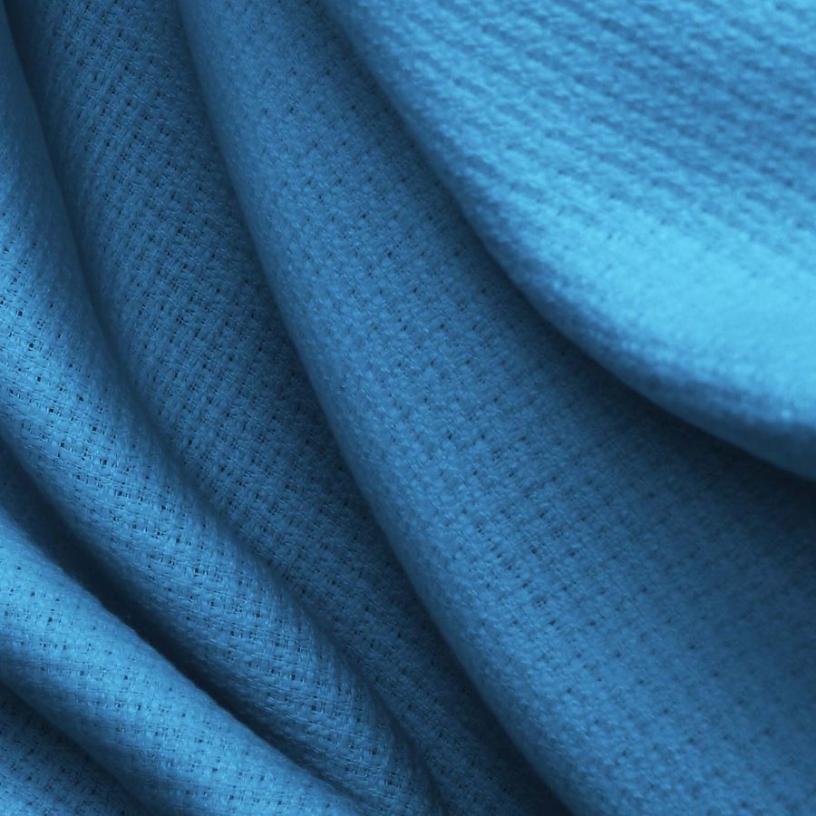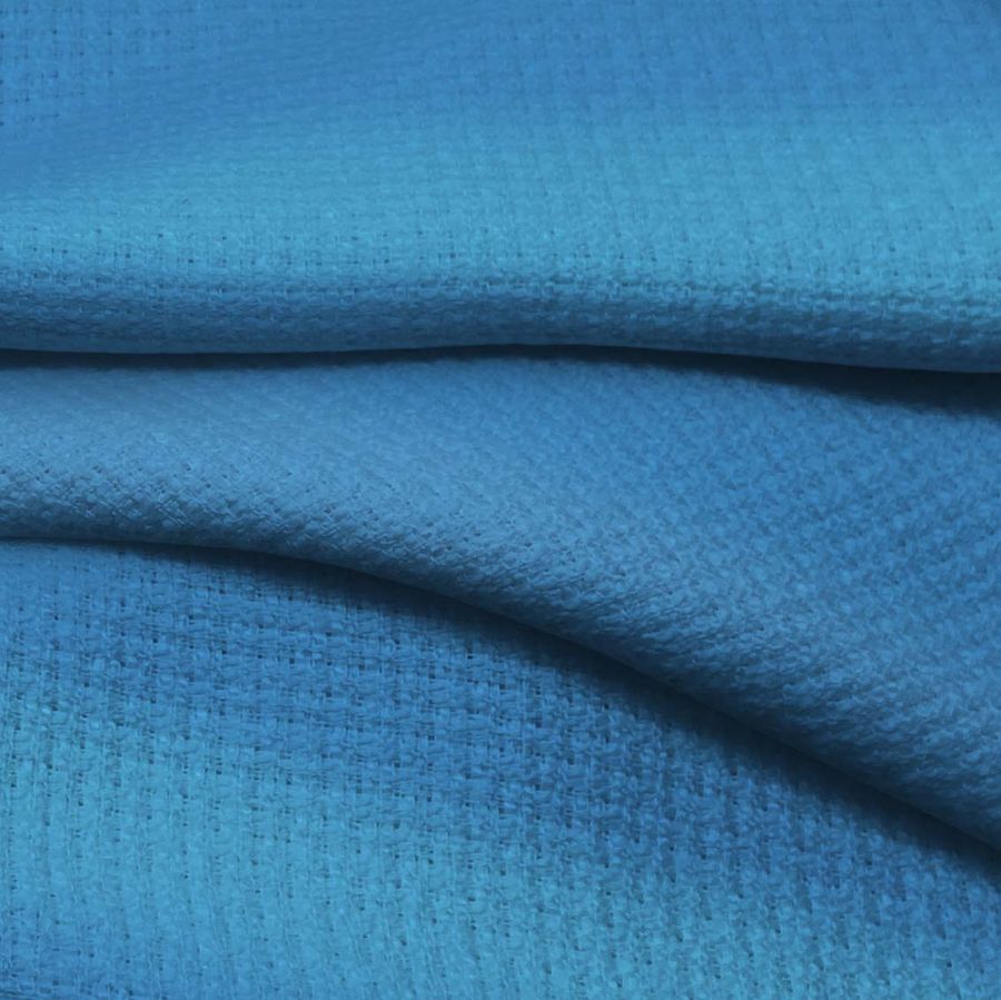 La tela base es el Tweed - Chanel, compuesta al 100% de poliéster con un gramaje de 420 gr/m2 y una anchura de 150 cm. En cuanto a su color liso impreso, se trata de un Azul Virgen con los siguientes valores CMYK: 77 40 6 0. Este color se presenta en un tono intermedio entre el azul y el verde, evocando la calma y la serenidad propias del mar. Combinado con otros colores, como el blanco y el negro, resulta fácilmente transportable a múltiples contextos y aplicaciones.