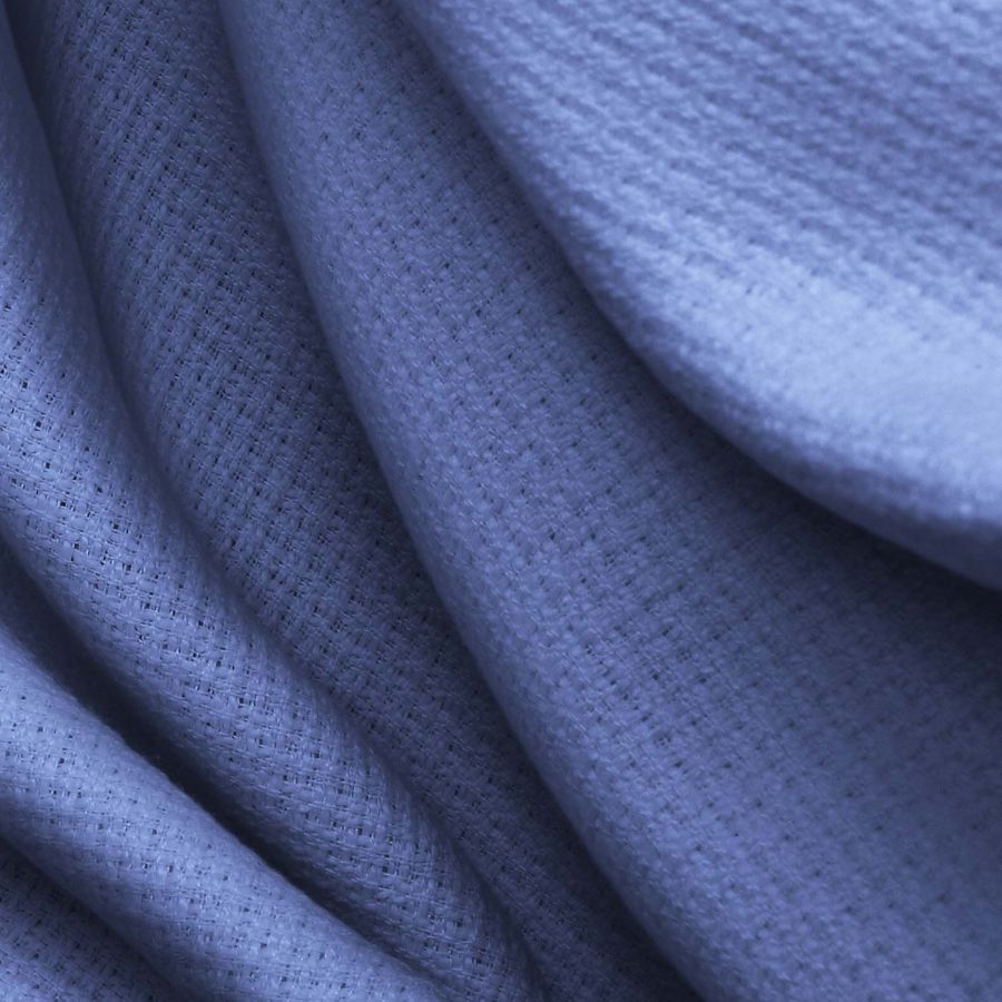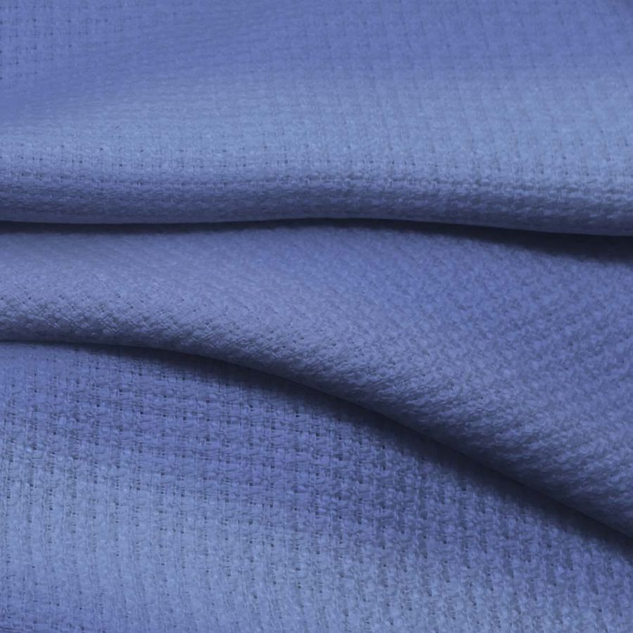 La tela base es el Tweed - Chanel, compuesta por un 100% poliéster y un gramaje de 420 gr/m2, con un ancho de 150 cm. El color liso impreso es un azul zafiro, con un CMYK de 67 53 3 0, que combina perfectamente con el blanco y el marrón. Esta tela está impresa con el color liso a una sola cara por impresión digital textil.