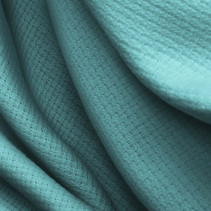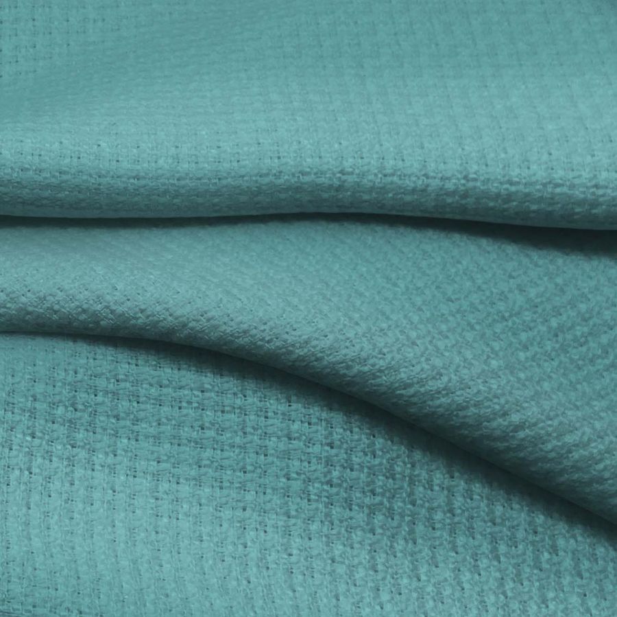 La tela base es un Tweed - Chanel de poliéster con un gramaje de 420 gr/m2 y un ancho de 150 cm. El color liso impreso es un azul Cadet Blue con un CMYK de 65% de cian, 21% de magenta, 37% de amarillo y 4% de negro. Este color es un tono profundo y apasionado que evoca el mar y la serenidad. Se combina perfectamente con tonos gris plateado, negro y un rosa palo suave.