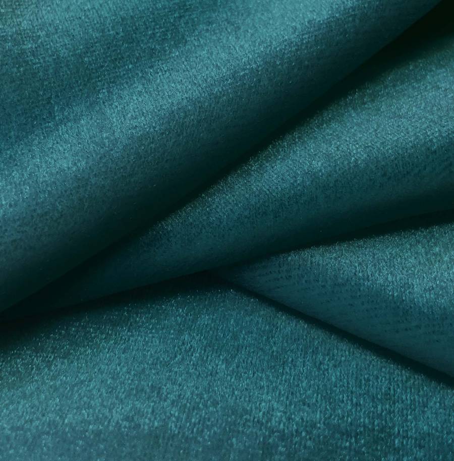 La tela base, Terciopelo Retro - Paris, es un suave y brillante tejido de terciopelo con una composición de 93% poliéster y 7% elastano. El color Teal profundo, representado por un CMYK de 93 50 52 49, es un tono verde profundo con matices de azul, que combina especialmente bien con colores neutros como el blanco, negro y gris. La tela está impresa con este color liso en una sola cara mediante impresión digital textil.
