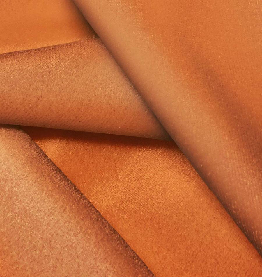 La tela base, Terciopelo Retro - Paris, es de terciopelo con composición de 93% polyester y 7% elastano. El color impreso es Naranja Zorro, con un CMYK de 16 69 92 5, que se caracteriza por ser un tono cálido y vibrante. Este color combina especialmente bien con tonos neutros como el blanco, el gris y el beige, así como con colores complementarios como el azul y el verde.
