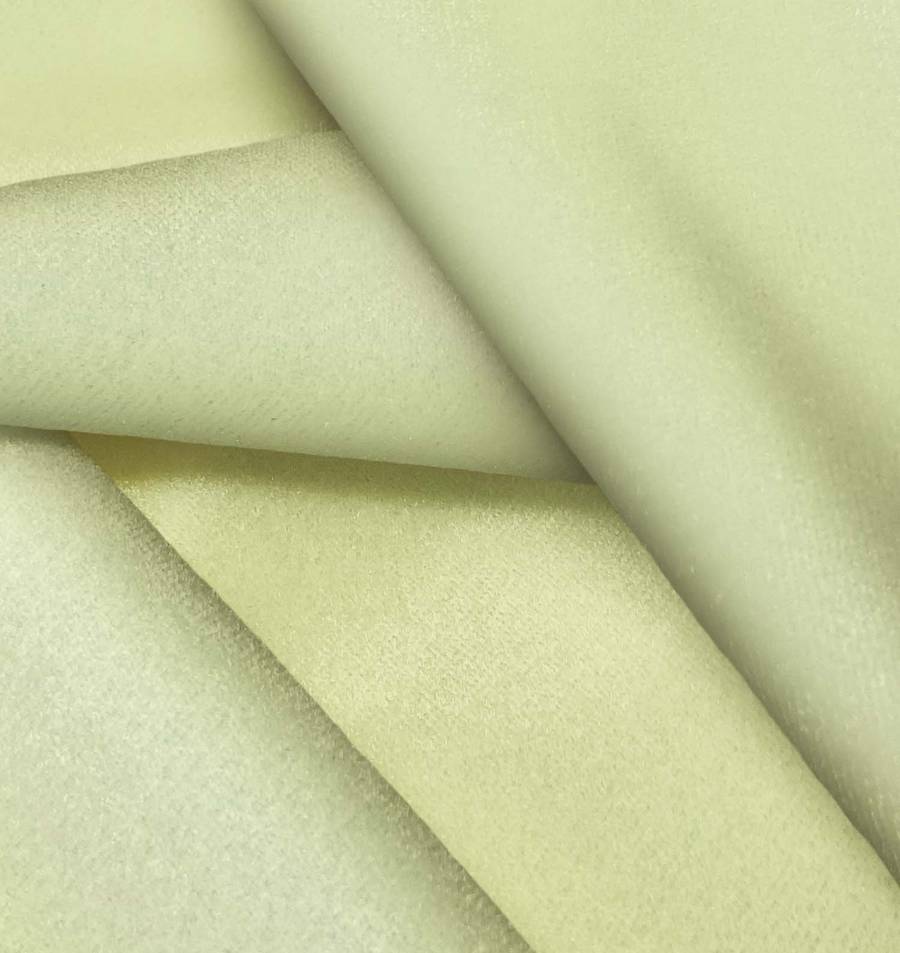 La tela base es Terciopelo Retro - Paris, de composición 93% POLIÉSTER, 7% ELASTANO, con un color liso impreso en Verde Oliva, con un CMYK de 29 9 53 0. Este color simboliza la estabilidad y la paz, combina bien con tonos tierra y neutros.