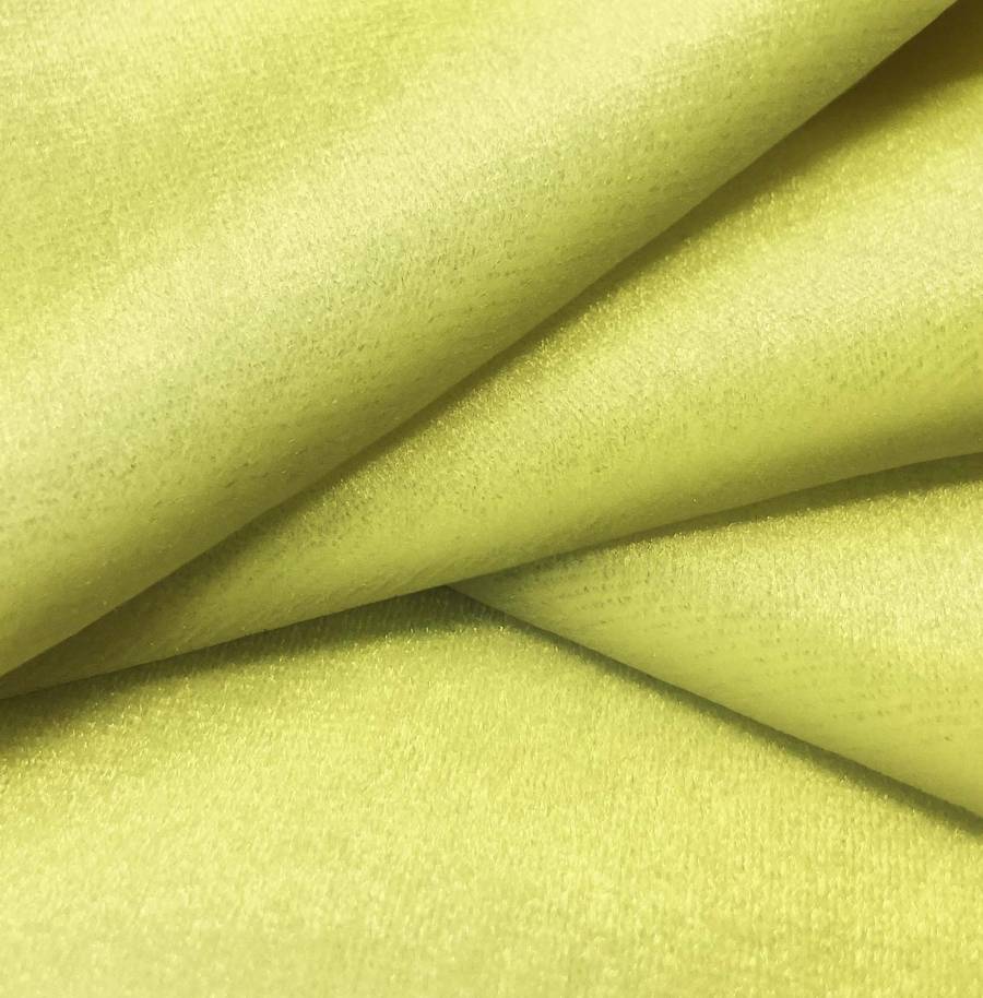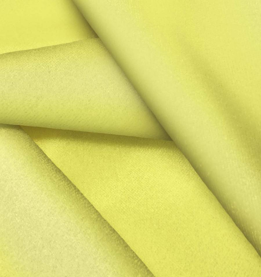 La tela base, Terciopelo Retro - Paris, es un suave terciopelo de composición 93% poliéster y 7% elastano, con un gramaje de 245 gr/m2 y un ancho de 150 cm. Su color liso impreso es Amarillo Plátano, con un CMYK de 18 2 75 0. Este color evoca la frescura y la alegría del verano, combina especialmente bien con tonos neutros como blanco o gris.