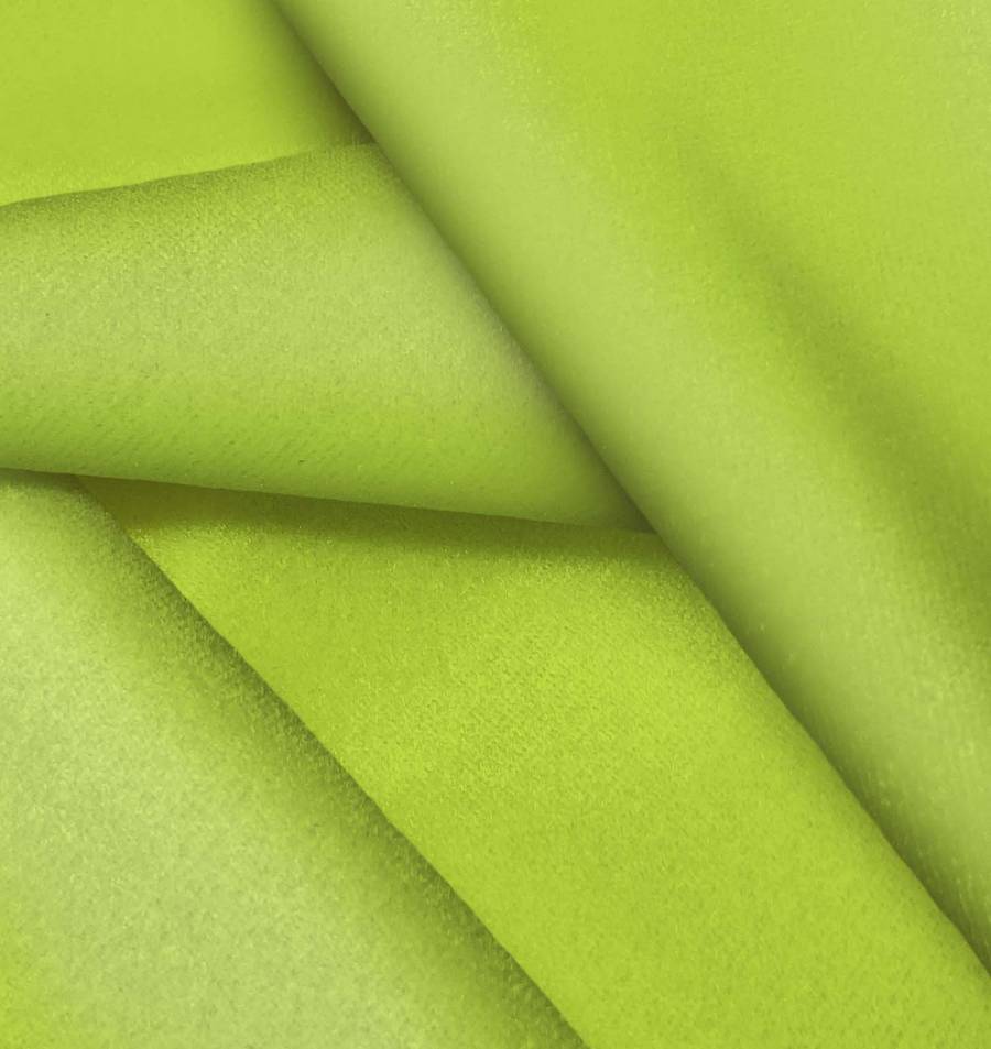 La tela base, Terciopelo Retro - Paris, es de terciopelo con una composición de 93% poliéster y 7% elastano. Su color liso impreso es Verde Pistacho, con un CMYK de 49 8 94 0. Es un color brillante y vibrante que combina muy bien con tonos neutros como blanco, gris y negro.