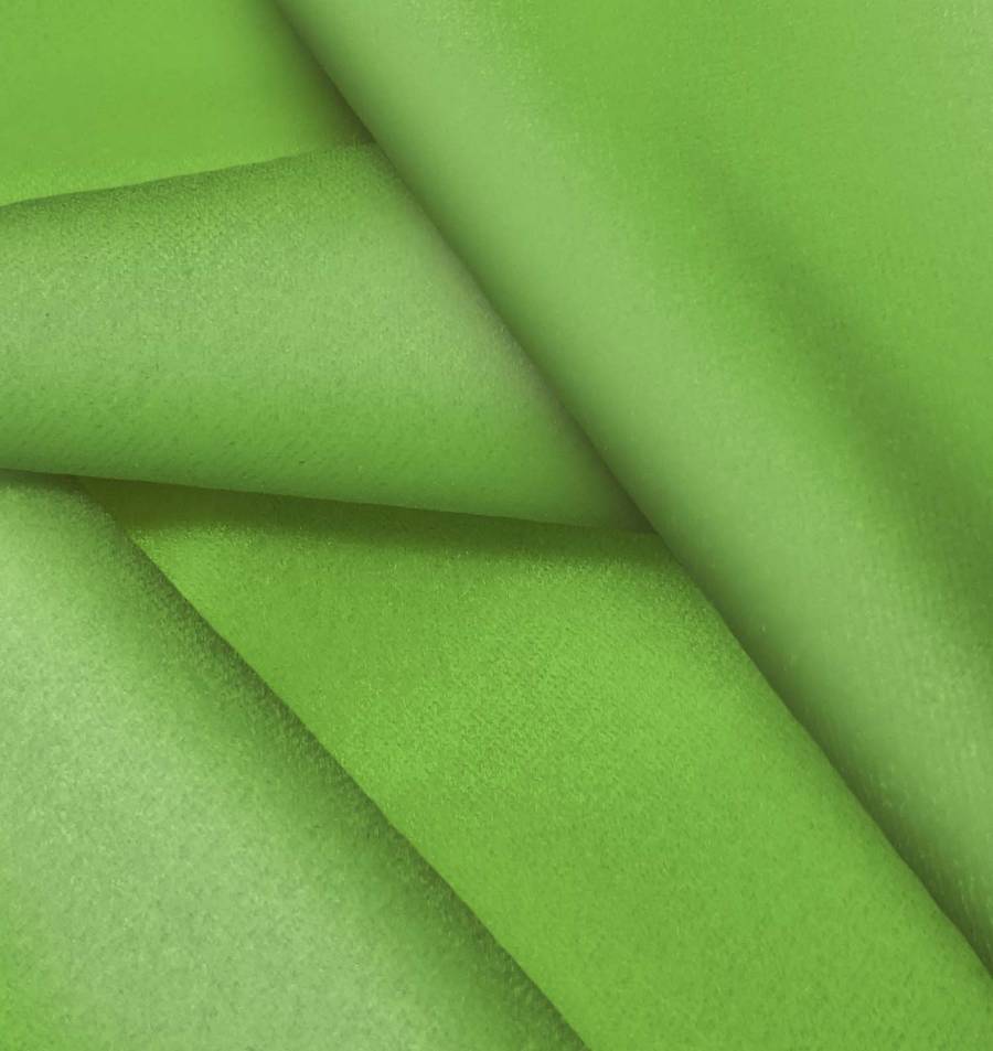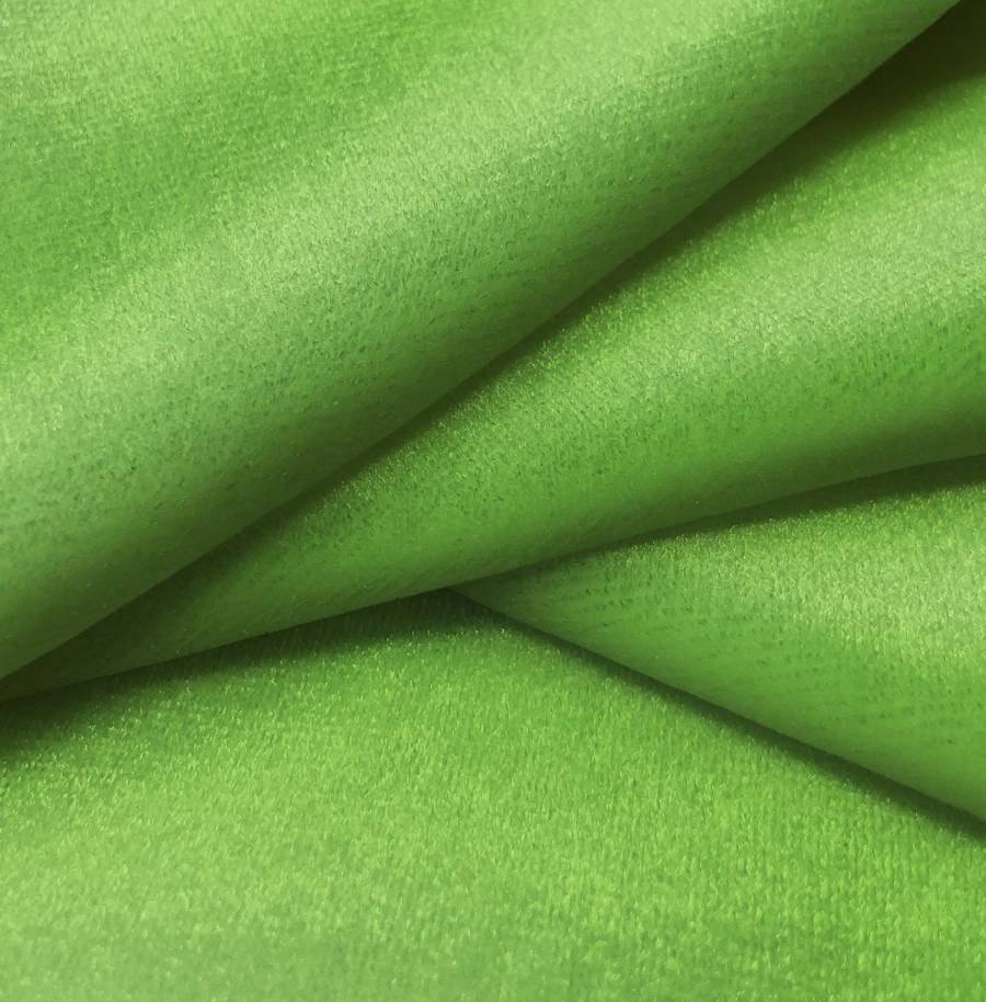 La tela base, Terciopelo Retro - Paris, se caracteriza por ser de terciopelo, con una composición de 93% poliéster y 7% elastano. El color liso impreso es Verde Alga, con un CMYK de 67 18 96 3, un tono vibrante y brillante que combina especialmente bien con tonos tierra, beige y marrones.