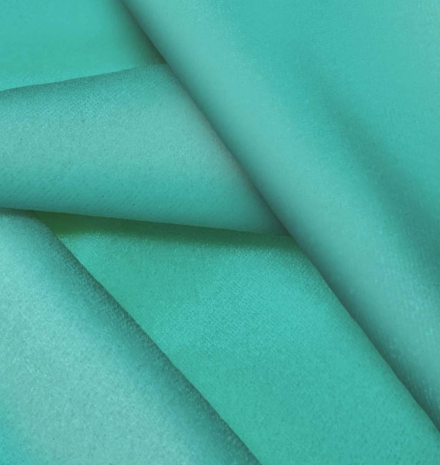 La tela base, Terciopelo Retro - Paris, es un suave y brillante terciopelo de 93% poliéster y 7% elastano, con un gramaje de 245 gr/m2 y un ancho de 150 cm. El color liso impreso es Verde Espuma de Mar con un CMYK de 75 16 47 2, que combina a la perfección con colores neutros como el blanco y el gris, así como con tonos cálidos como el oro o el coral.