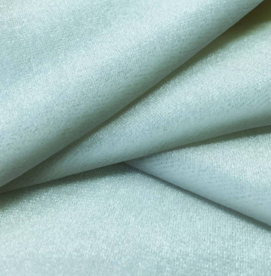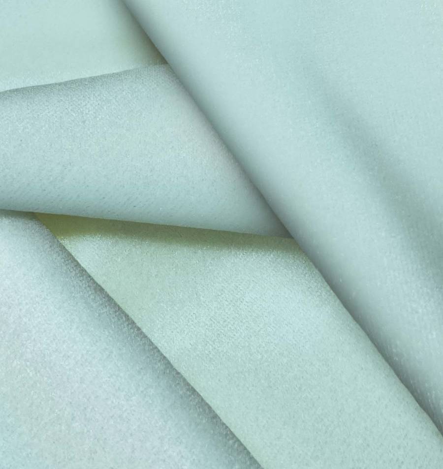 La tela base es Terciopelo Retro - Paris, de color verde menta con el siguiente CMYK: 43 8 25 0. Este color transmite frescura y tranquilidad, ideal para decoración y moda primaveral. Combina perfectamente con tonos neutros, como blanco, gris y beige.