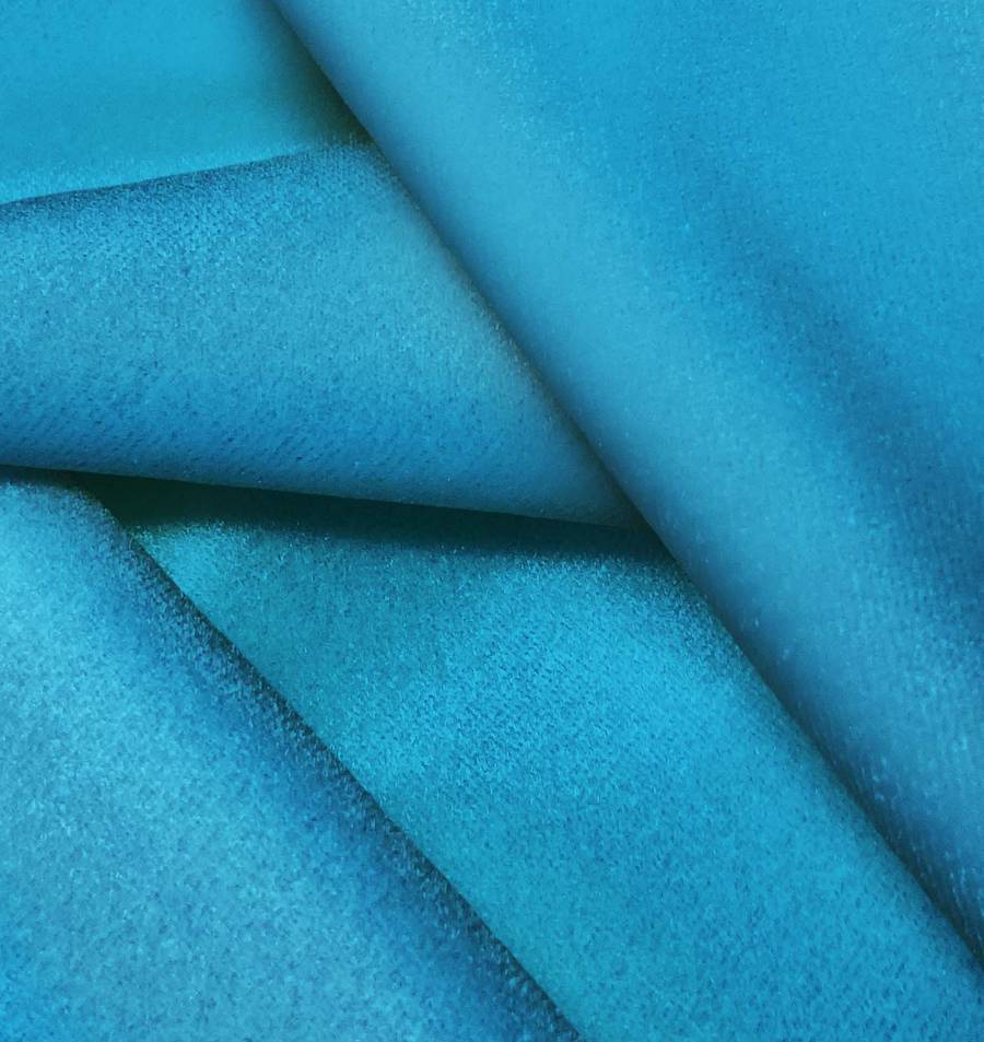 La tela base, Terciopelo Retro - Paris, es un terciopelo compuesto por un 93% de poliéster y un 7% de elastano, con un gramaje de 245 gr/m2 y un ancho de 150 cm. El color liso impreso es Azul Windows, con un CMYK de 82 33 11 1. Este tono de azul brillante, suave y elástico, combina perfectamente con colores como blanco, gris y plata.