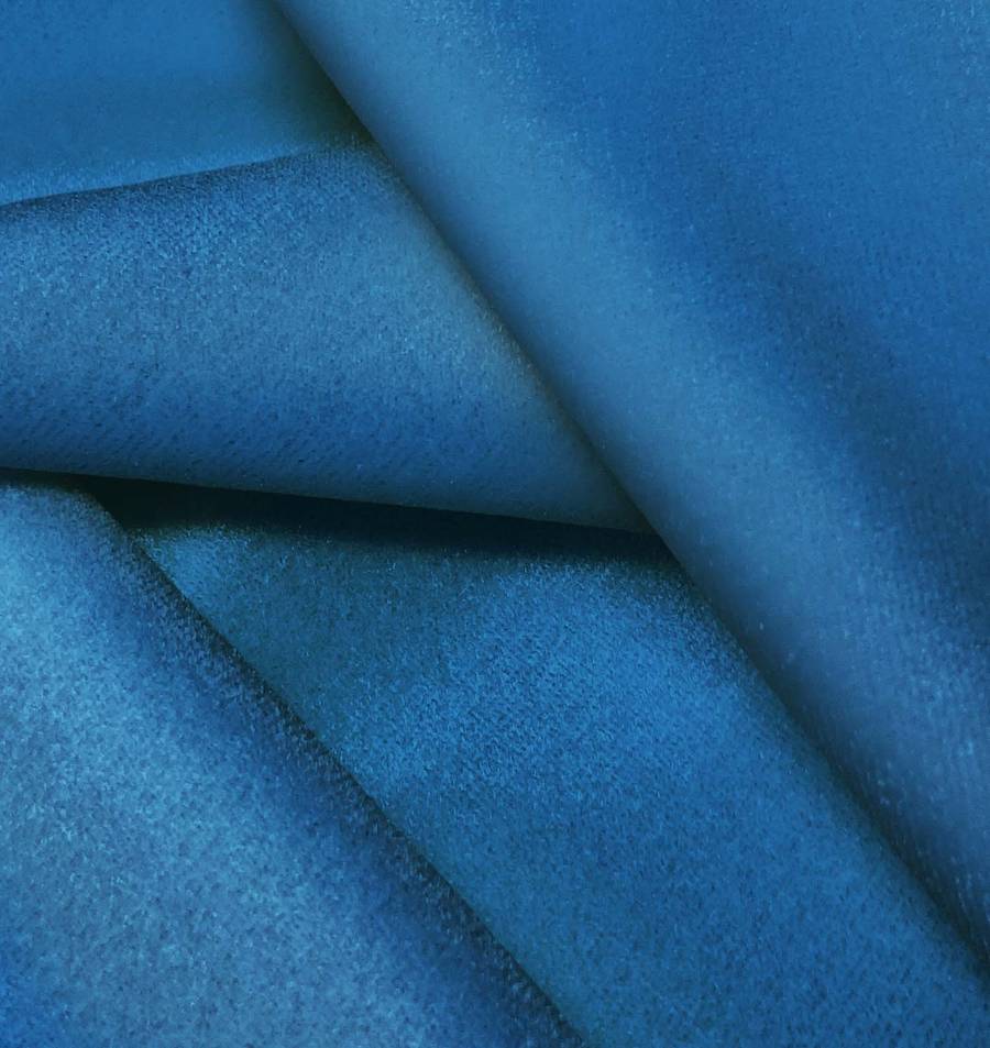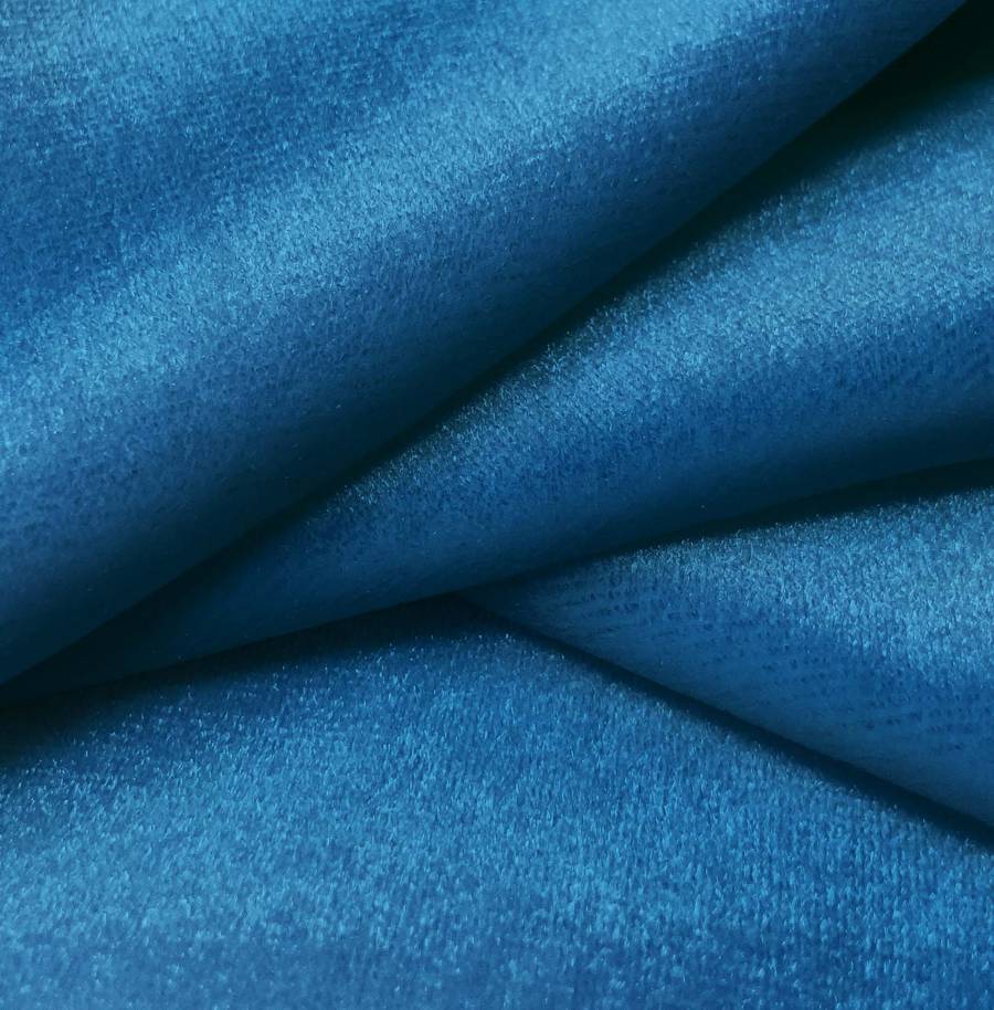 La tela base, Terciopelo Retro - Paris, es un terciopelo de composición 93% poliéster y 7% elastano en un color azul arrendajo, con un CMYK de 96 64 22 6. Este color es una mezcla vibrante de azules y verdes, evocando la frescura y la vitalidad de la naturaleza. Combina especialmente bien con tonos neutros como el blanco, el gris y el negro, realzando su brillo y luminosidad.