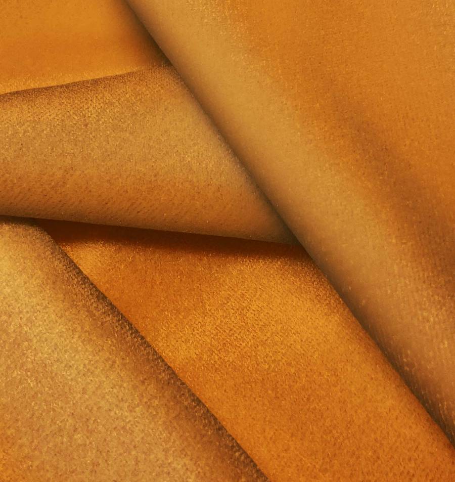 La tela base es un Terciopelo Retro - Paris de composición 93% POLIÉSTER y 7% ELASTANO, con un gramaje de 245 gr/m2. El color impreso es Naranja Albaricoque, con un CMYK de 20 65 100 9. Este color cálido y vibrante combina muy bien con tonos neutros como beige, blanco o gris, resaltando su luminosidad y brillo característicos.