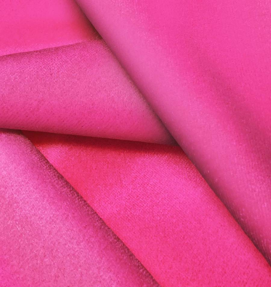 La tela base, Terciopelo Retro - Paris, es un tejido de terciopelo con una composición de 93% poliéster y 7% elastano, de color rosa Barbie con una combinación de tinta magenta en un 86% y tinta amarilla en un 10%, reflejando un CMYK de 0 86 10 0. Su textura suave y brillante le proporciona un aspecto elegante y lujoso, ideal para prendas de vestir y decoración. El color se combina especialmente bien con tonos neutros como blanco, negro o gris.