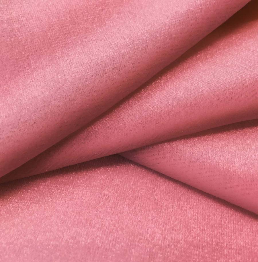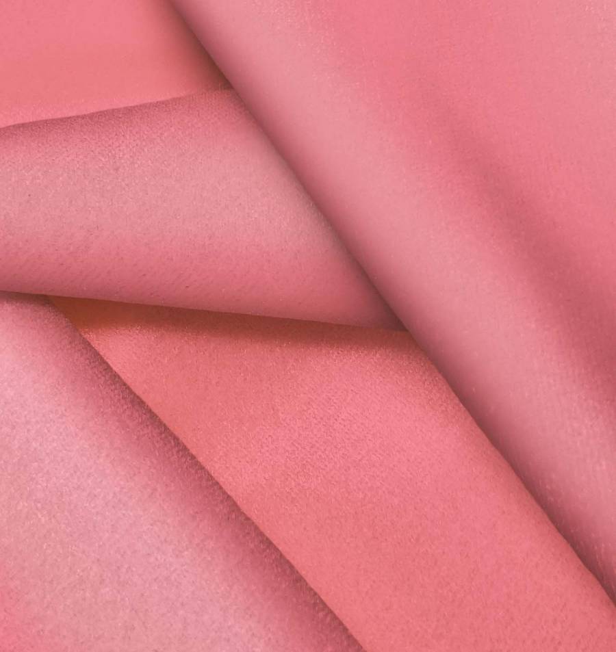 La tela base, Terciopelo Retro – Paris, es de terciopelo con una composición de 93% poliéster y 7% elastano. El color liso impreso es Rosa Claro Carmín, con un CMYK de 4 72 44 0. Este color secundario simboliza la delicadeza y la pasión, combinando a la perfección con tonos neutros y metálicos.