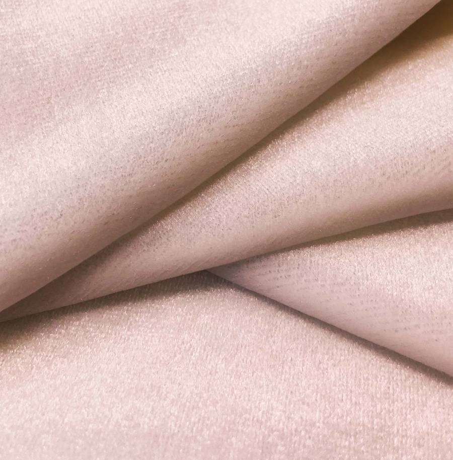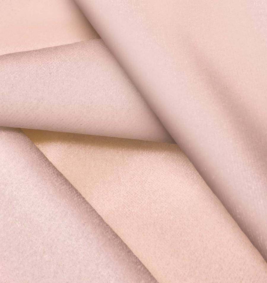 La tela base, Terciopelo Retro - Paris, es un suave y brillante tejido de terciopelo en tono rosa nácar, con un CMYK de 2 36 27 0. Este color evoca elegancia y feminidad, combinando especialmente con tonos neutros como blanco y gris.