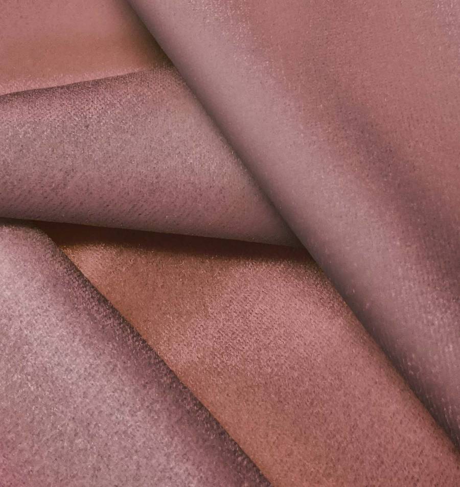 La tela base, Terciopelo Retro - Paris, es de terciopelo con una composición de 93% poliéster y 7% elastano. Su color liso impreso es Rosa Taupe con un CMYK de 32 61 47 30, combinando tonos rosados y marrones. La tela está impresa a una sola cara por impresión digital textil.