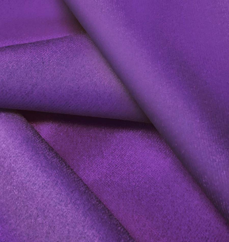 El tejido está impreso con el color liso a una sola cara por impresión digital textil, lo que le confiere una vibrante intensidad y nitidez en el color. Además, al ser un material de tipo poliéster, la tela base es suave al tacto, elástica y posee un brillo característico que realza el color Morado-Purpúreo.
