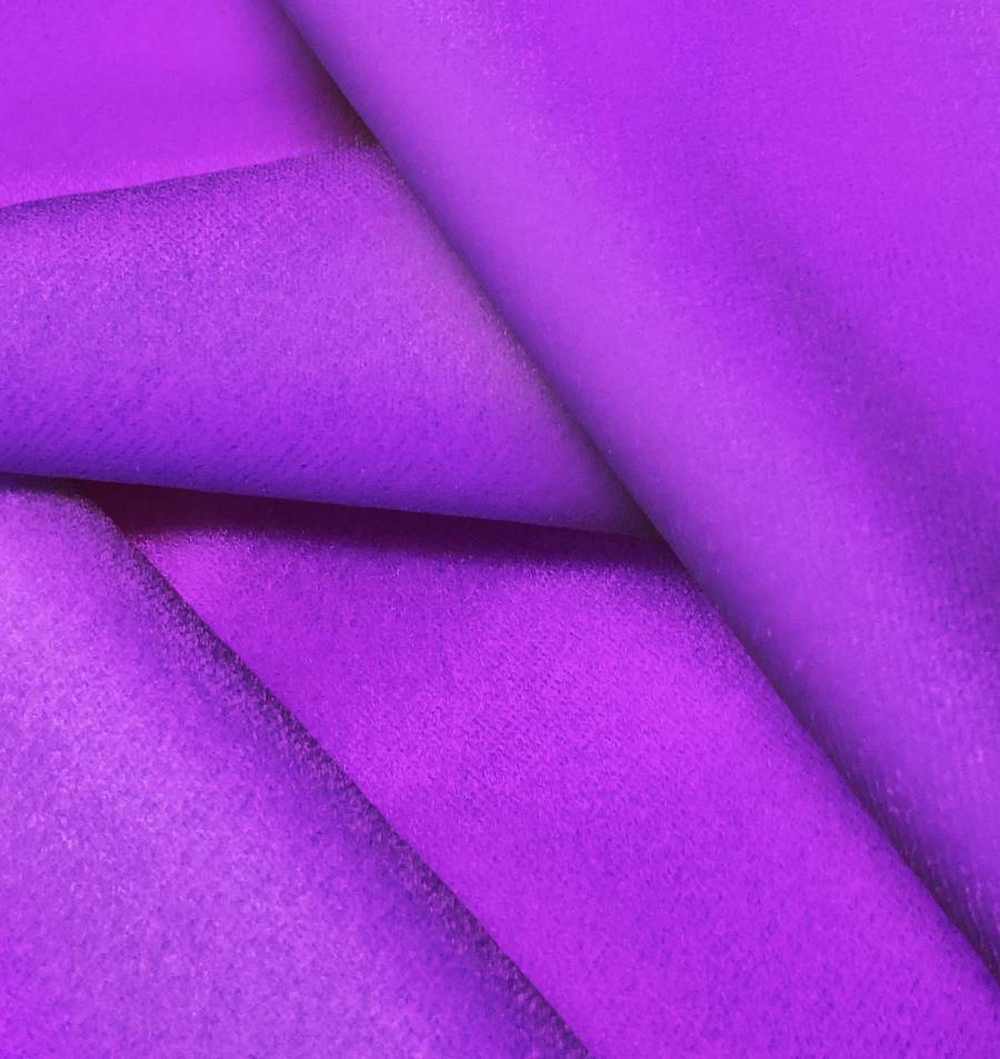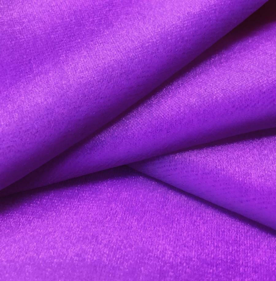 La tela base, Terciopelo Retro - Paris, es de terciopelo con composición de 93% poliéster y 7% elastano. El color liso impreso es Morado Lila brillante, con CMYK de 70 81 0 0. Combina perfectamente con tonos neutros como el blanco, negro y gris.