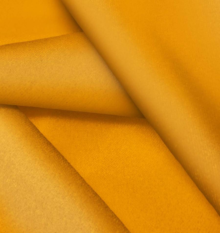 La tela base, Terciopelo Retro - Paris, es un suave y brillante terciopelo de poliéster/elastano en tono naranja, con un CMYK de 8-60-100-1. Este color evoca la vitalidad y la energía del fuego, se combina especialmente bien con tonos neutros como el blanco, negro y gris, así como con tonos complementarios como el azul y el verde, creando contrastes equilibrados y llamativos en cualquier diseño.