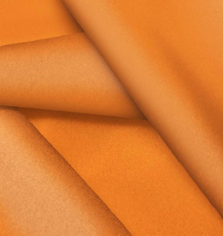 La tela base, Terciopelo Retro - Paris, es una tela de terciopelo de color naranja butano, con un perfil de color CMYK de 2 69 93 0. Este color evoca calidez y energía, combinando muy bien con tonos tierra y neutros, así como con azules y verdes para crear un contraste vibrante. El tejido está impreso con este color a una sola cara por impresión digital textil, lo que garantiza una alta calidad y durabilidad en el color.