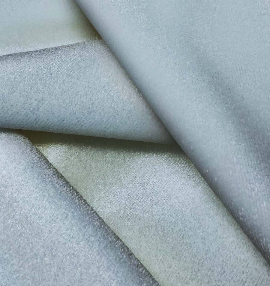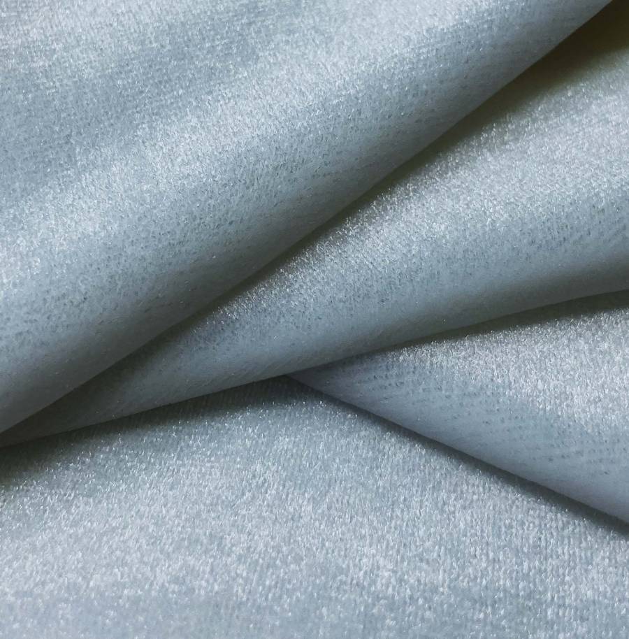 La tela base, conocida como Terciopelo Retro - Paris, destaca por su composición de 93% POLIÉSTER y 7% ELASTANO, con un gramaje de 245 gr/m2 y un ancho de 150 cm. El color liso impreso en este tejido es Gris y Alice Blue, con una proporción de tinta Cyan: 47, Magenta: 28, Yellow: 24, Black: 5 en el CMYK. Este color secundario, con tonos suaves y brillantes, combina especialmente bien con neutros como blanco, negro y gris.