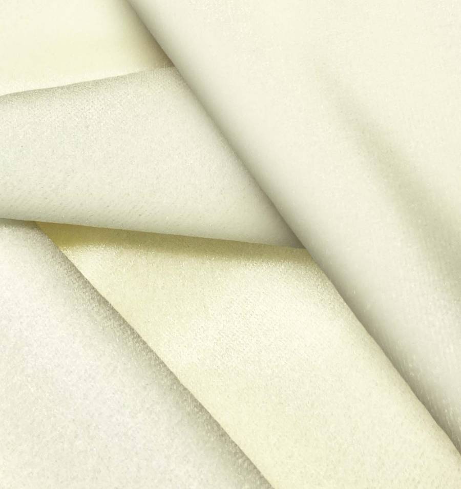 La tela base, Terciopelo Retro - Paris, es una suave tela de terciopelo con composición de 93% poliéster y 7% elastano, en color blanco y crema con un CMYK de 2 0 25 0. Este color crema es sutil y elegante, con tonos cálidos que se combinan perfectamente con colores tierra, dorados y neutros para lograr un aspecto sofisticado y acogedor.
