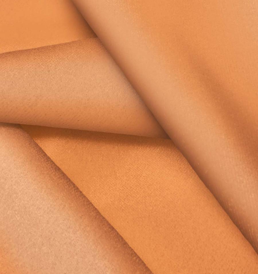 La tela base, Terciopelo Retro - Paris, es un lujoso terciopelo de poliéster y elastano con un gramaje de 245 gr/m2 y un ancho de 150 cm. En cuanto al color liso impreso, Naranja Melón, destaca por su combinación de tintas Cyan 7, Magenta 62, Yellow 76 y Black 1 en un perfil CMYK 7 62 76 1. Este color vibrante se complementa perfectamente con tonos cálidos como marrones, dorados y amarillos.